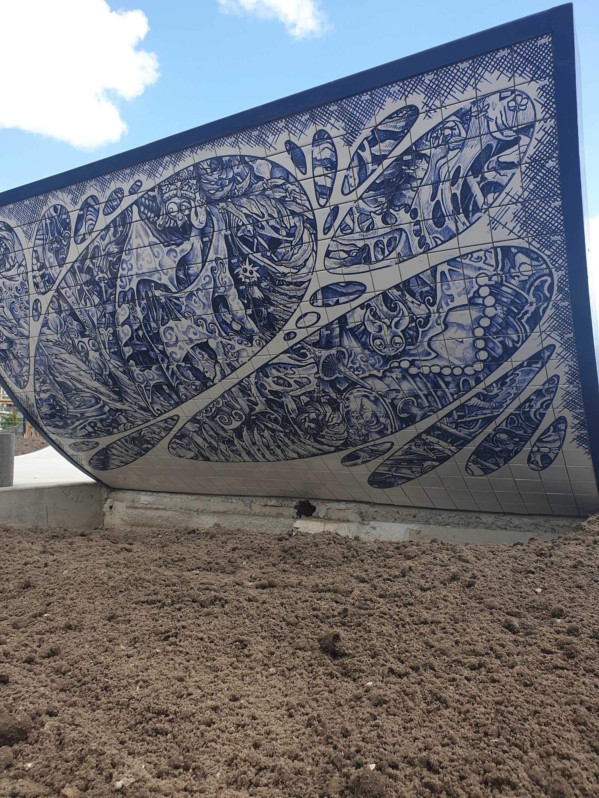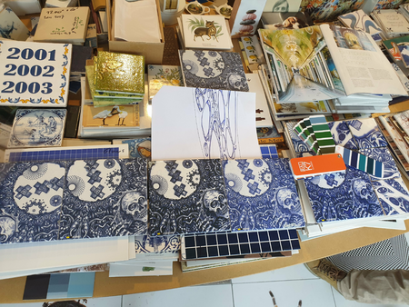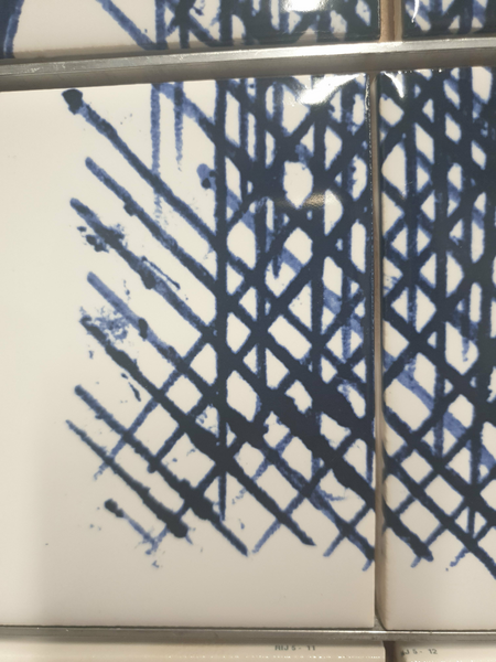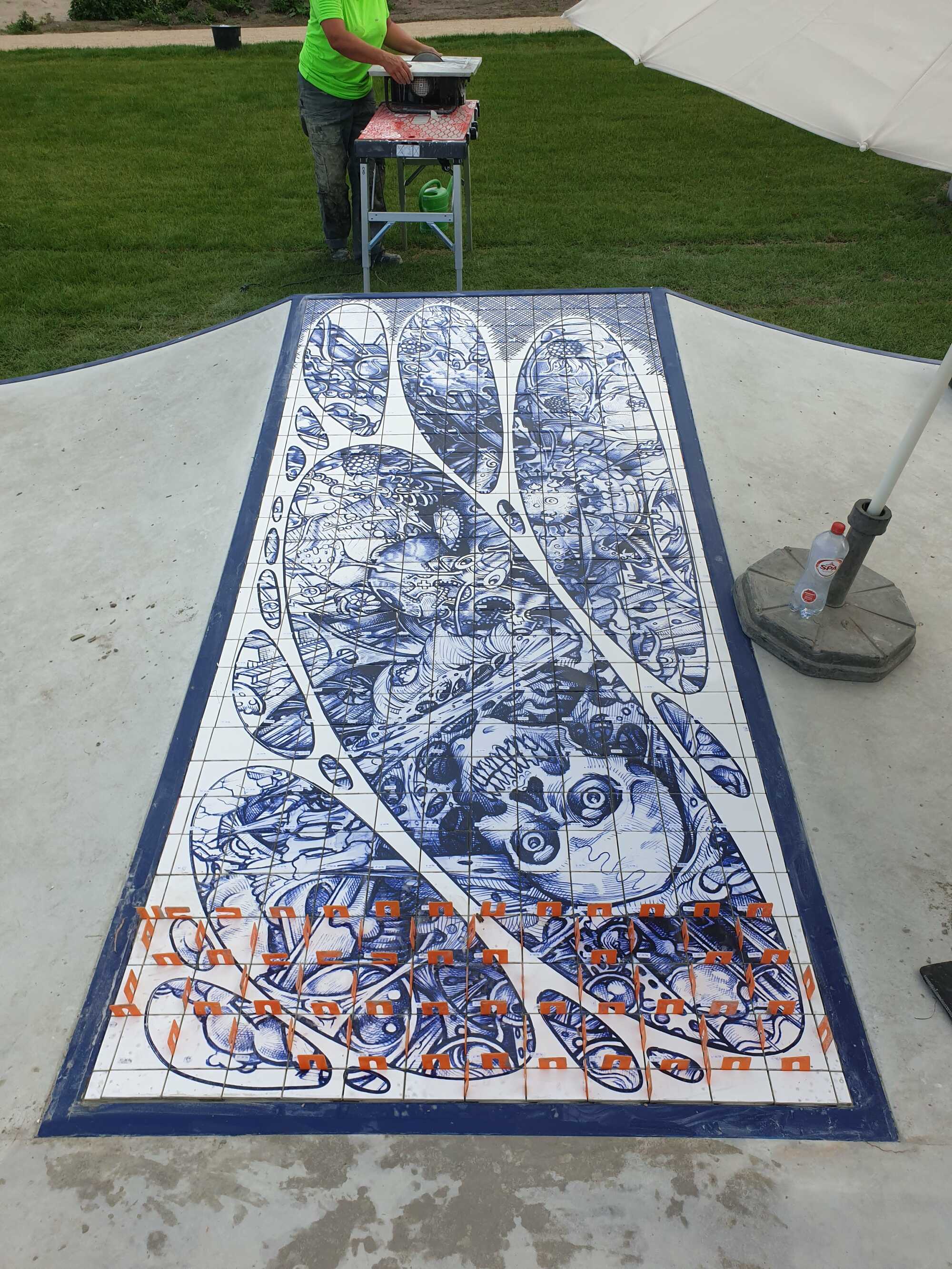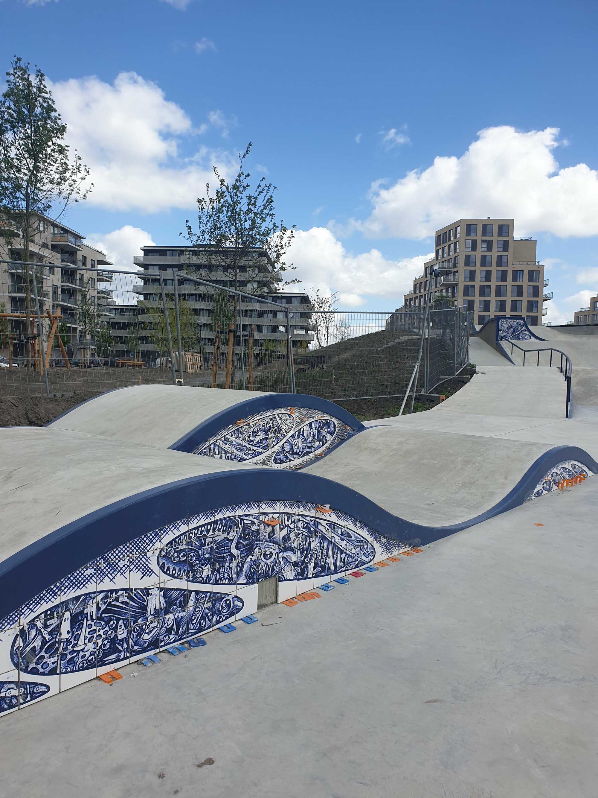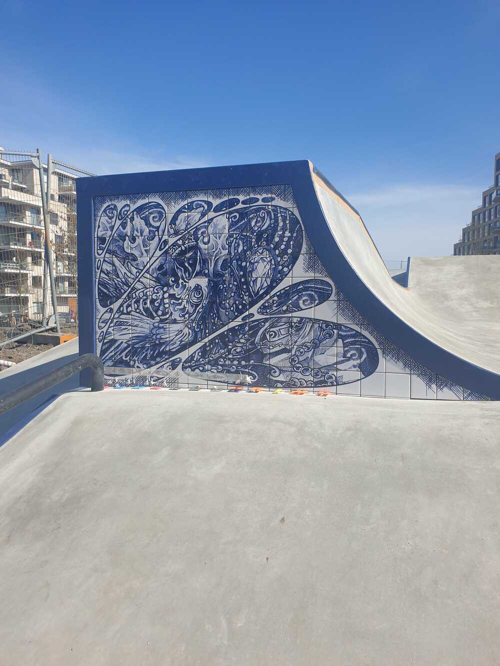 Skatepark on Zeeburgereiland in Amsterdam, commissioned by the city of Amsterdam. 12 tile panels were printed with glaze after drawings were colored in with ballpoint to resemble delft blue. 135m1 of 2,5x2,5 tiles 8 high were put around the pools.