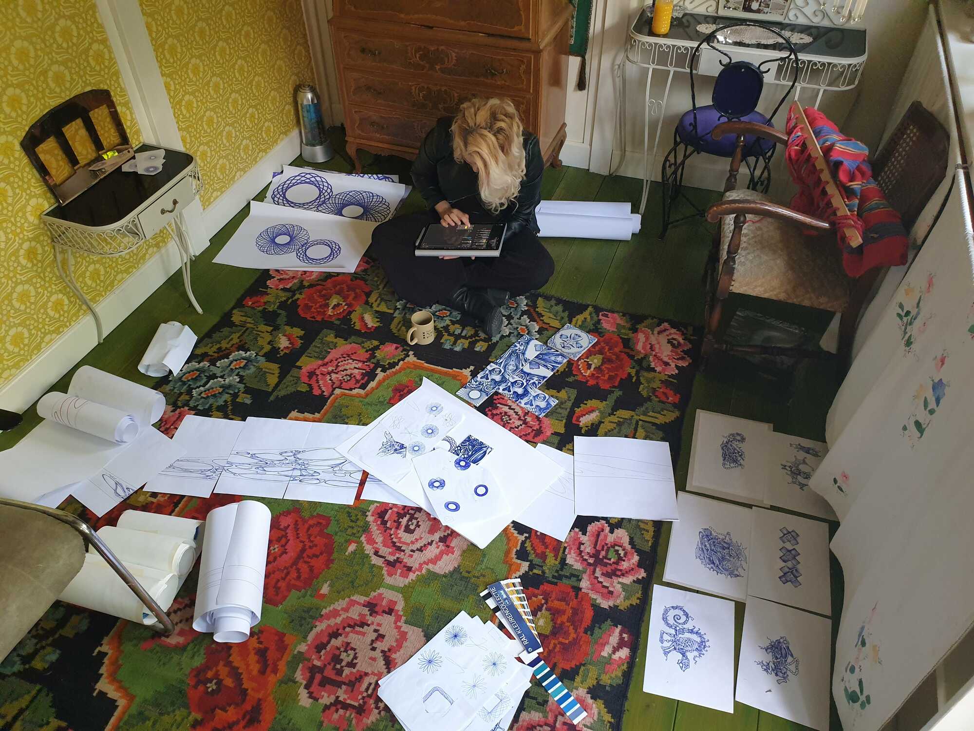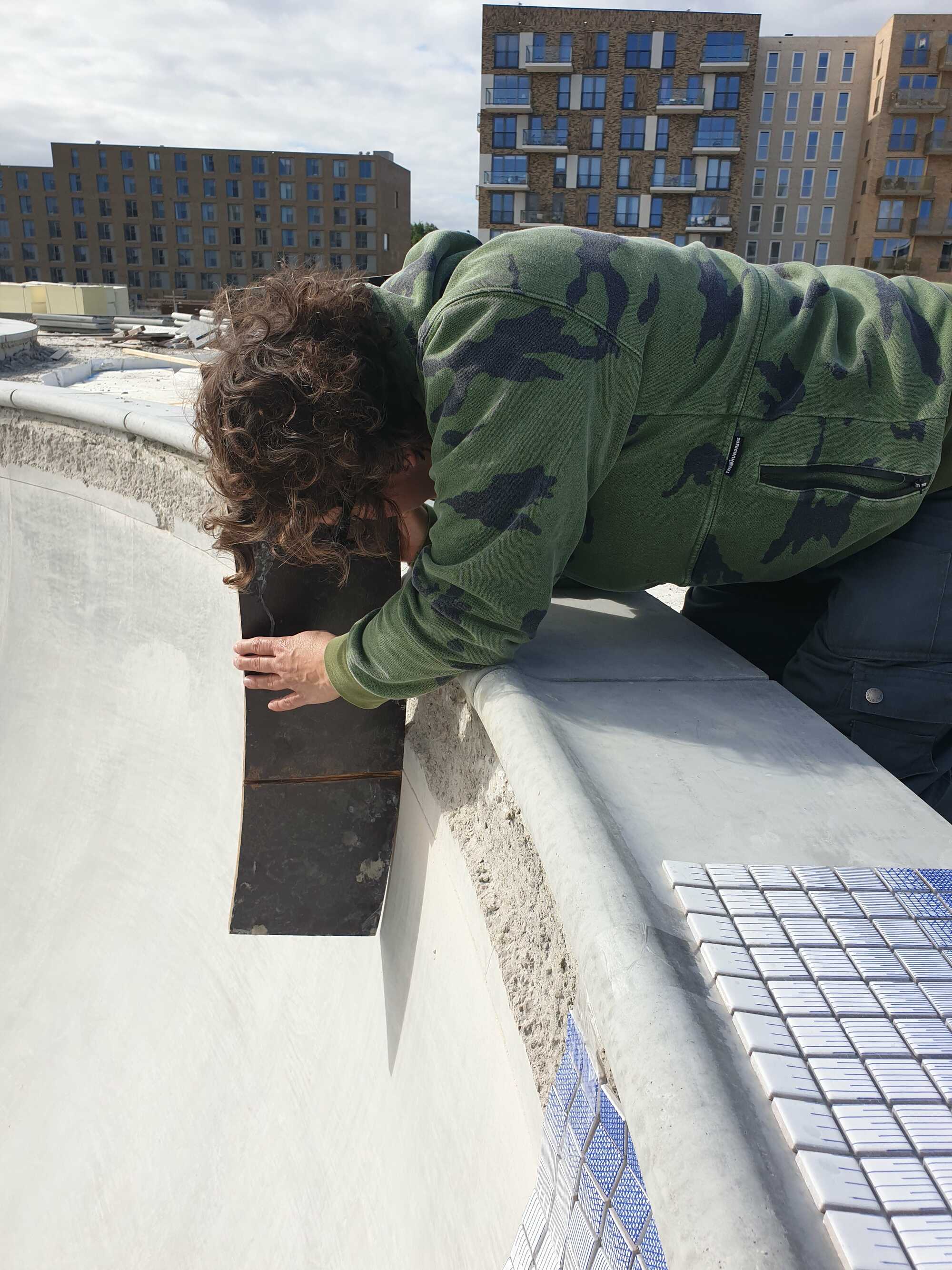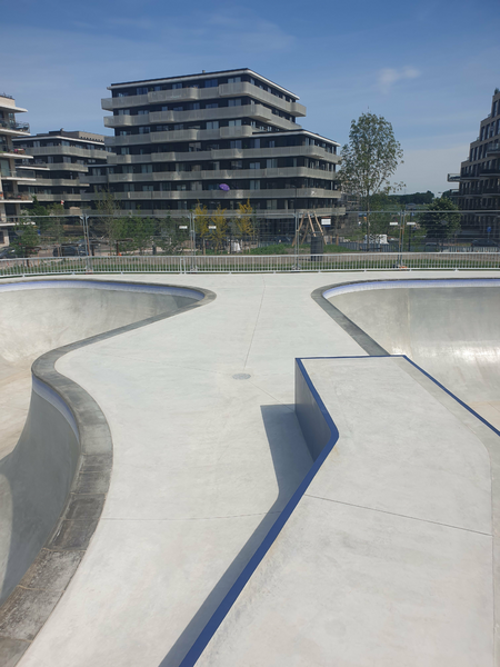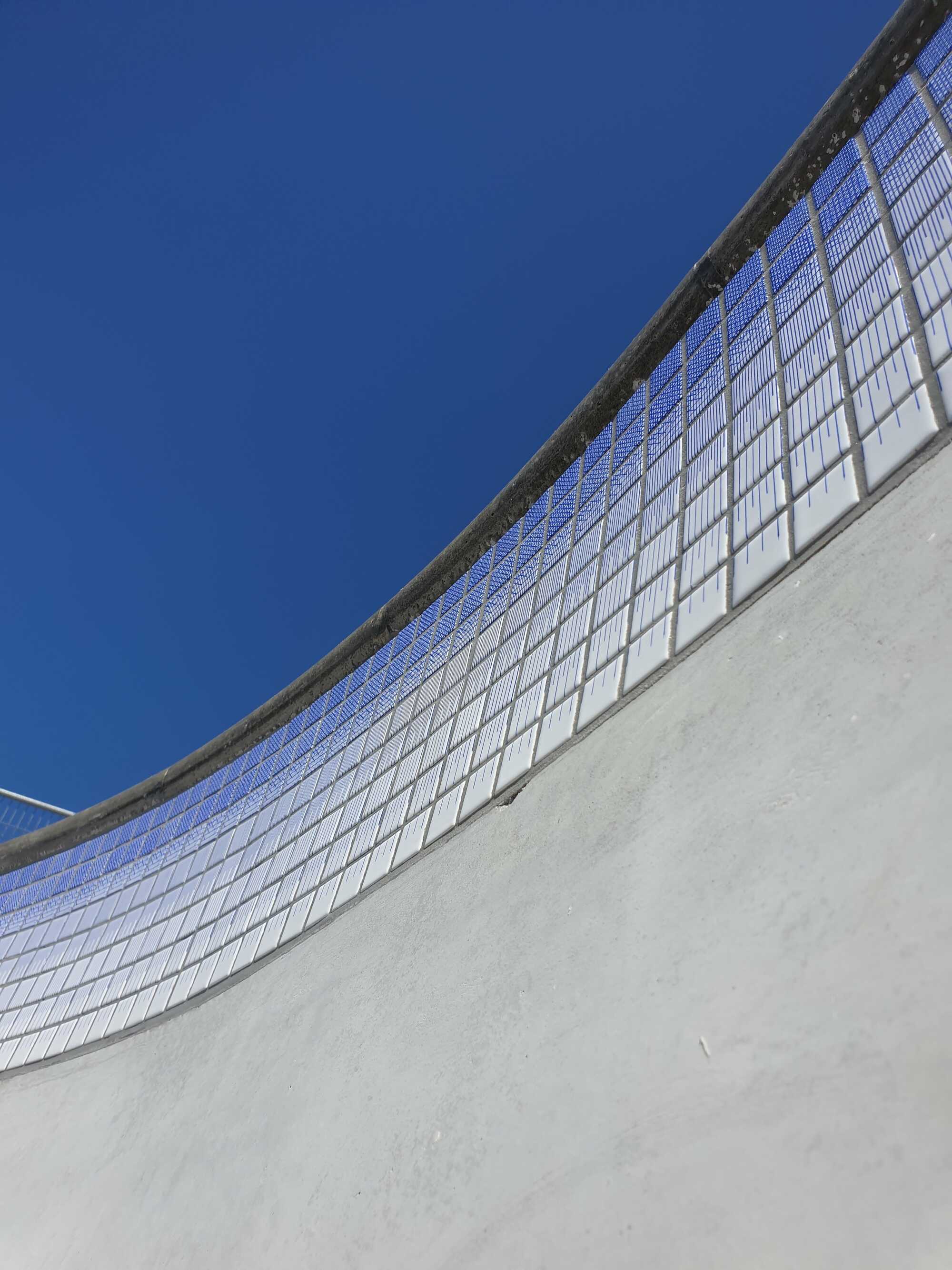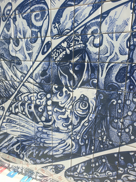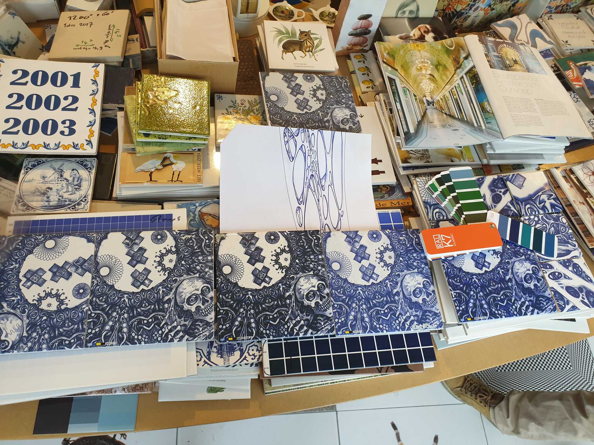 Skatepark on Zeeburgereiland in Amsterdam, commissioned by the city of Amsterdam. 12 tile panels were printed with glaze after drawings were colored in with ballpoint to resemble delft blue. 135m1 of 2,5x2,5 tiles 8 high were put around the pools.
