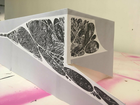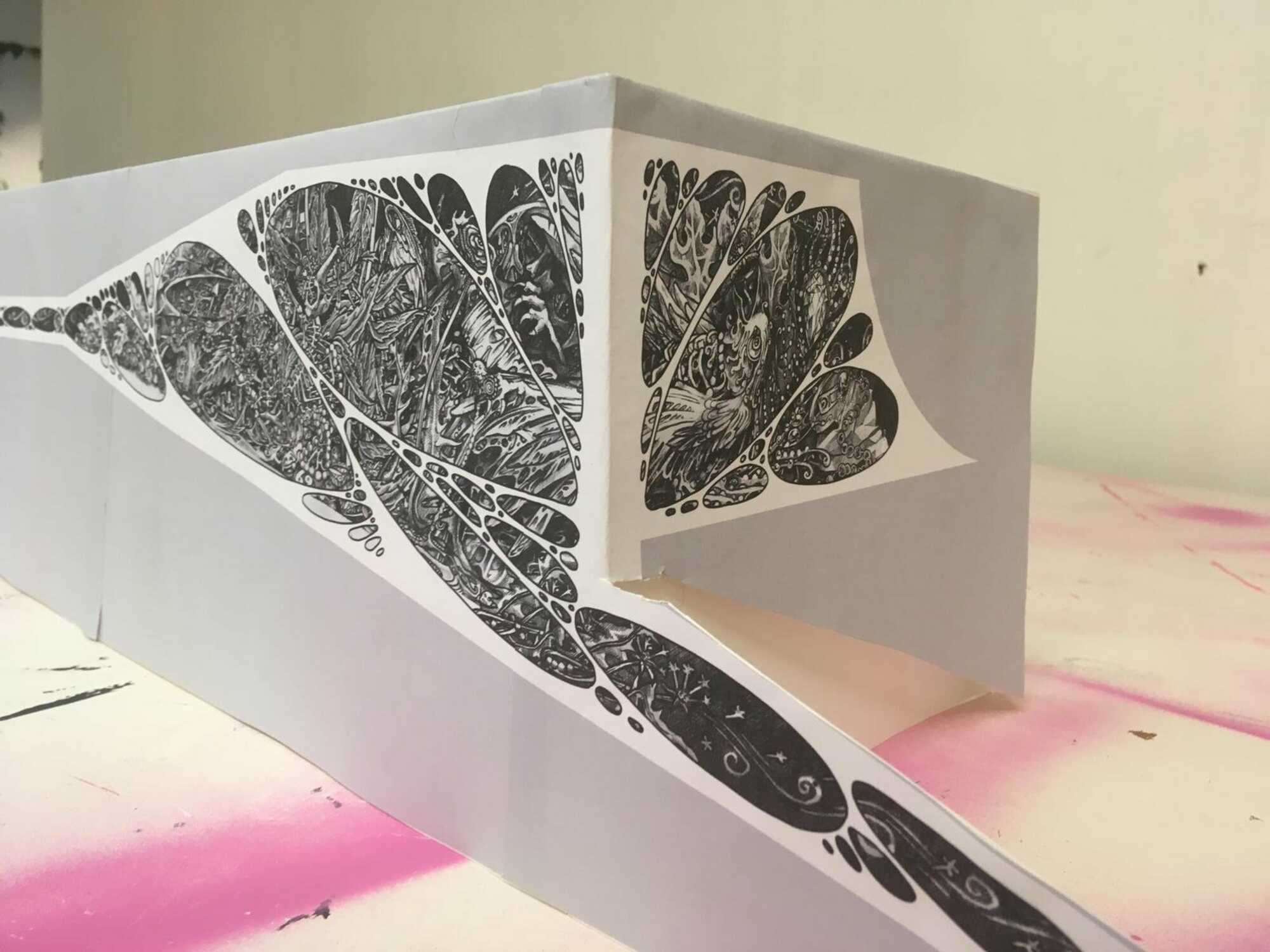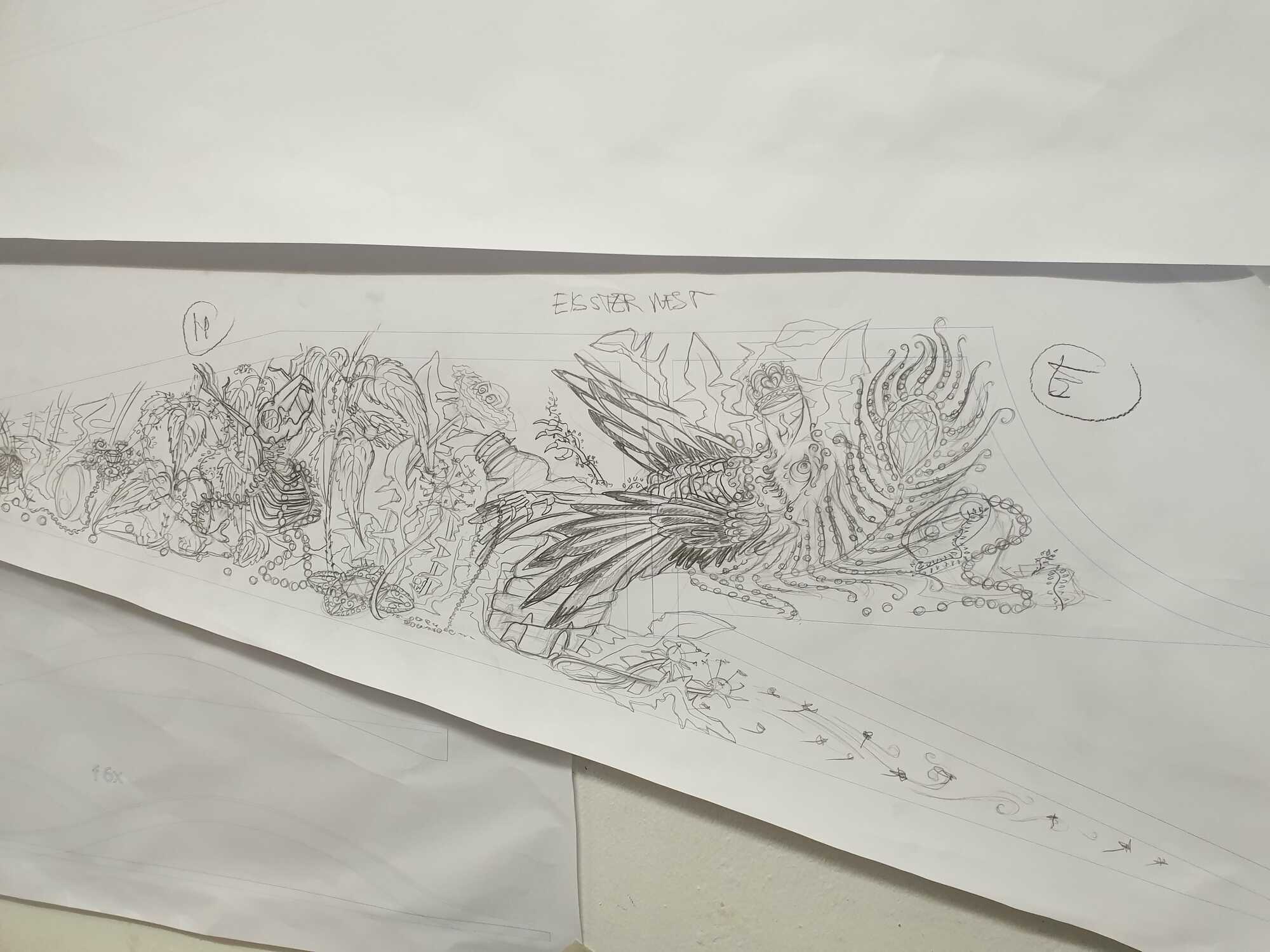 Because the surfaces were scatered the park is considered as a giant organism with holes were you can see inside. Skaters were in the early eighties not very popular so in the drawings you'll find other outcast such as pigeons, woodlice and trash.