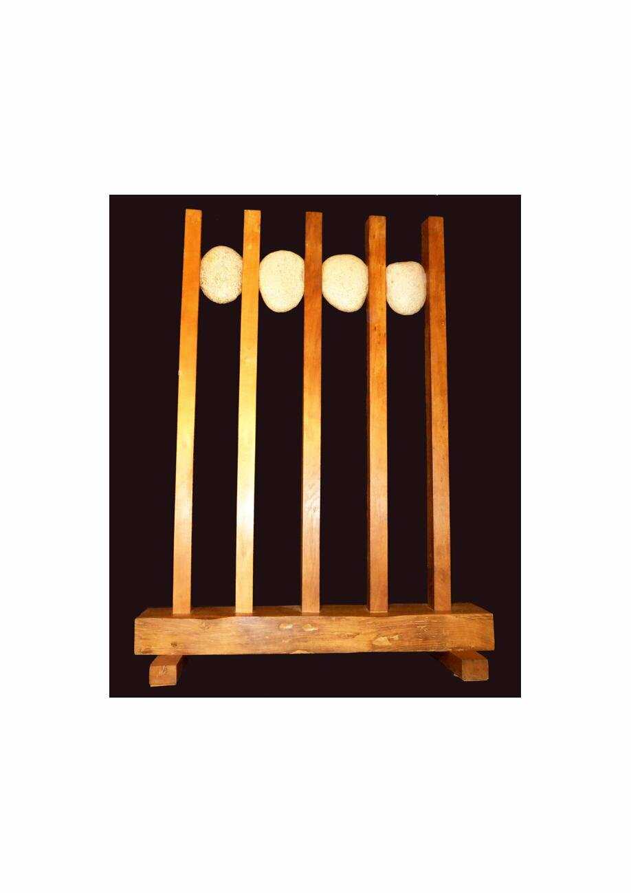 Trabajo abstracto, formado por madera de roble y cantos rodados de granito. Sobre una viga paralela al suelo surgen unos postes y entre ellos en la parte más lata se sujetan los cantosa rodados. Ensamblado a la base con cajetines y espigas y los cantos rodados a la madera con varilla roscada, La madera está lijada y encerada. La piedra al natural.