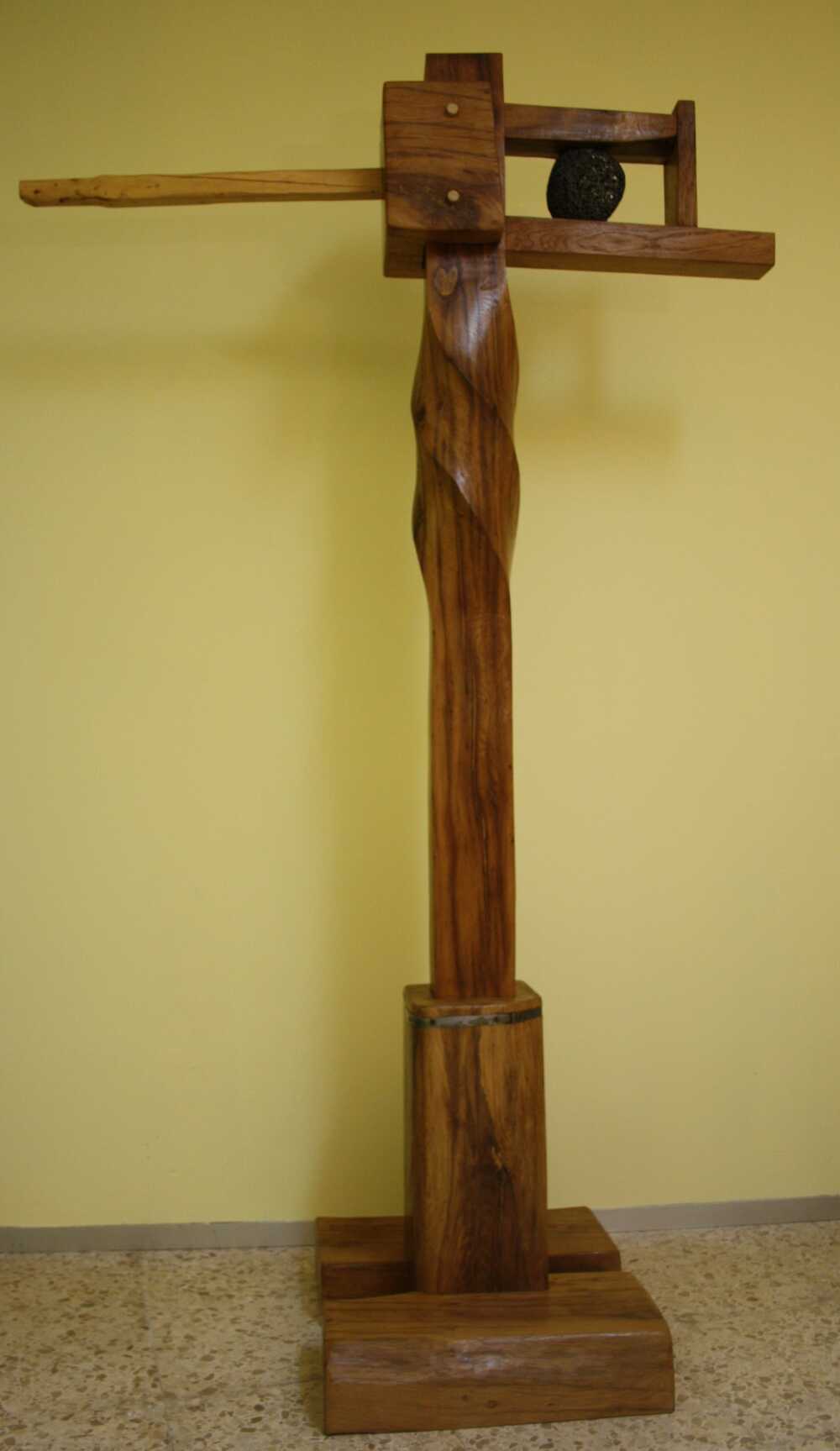 De estilo abstracto, obra trabajada en roble con una piedra volcánica. Una base con un vástago largo simulando estar roscado y con una prolongación para intentar someterlo a esfuerzo. Intenta dar la sensación de tortura y sufrimiento.