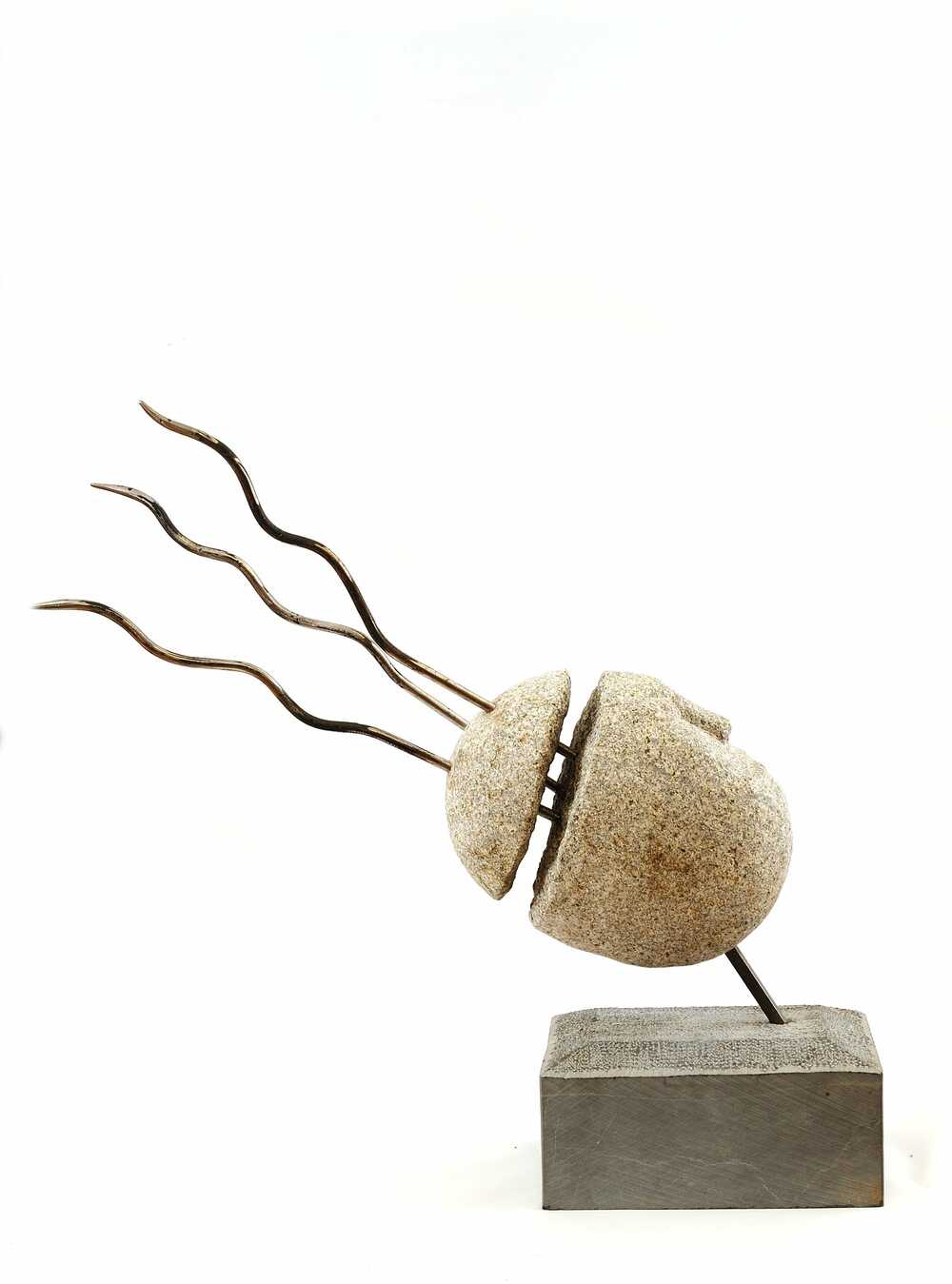 De estilo figurativo, se utiliza un canto rodado de granito, varillas de hierro y base de piedra de Calatorao. Se corta un casquete del canto rodado y en el otro se perfila la cara. El casquete es atravesado por tres pelos y se introducen en la otra parte de la cabeza. La cabeza se sujeta a la base con una varilla. Los hierros de la cabeza se pegan con resina. El acabado es natural, excepto la base que lleva una parte abujardada.