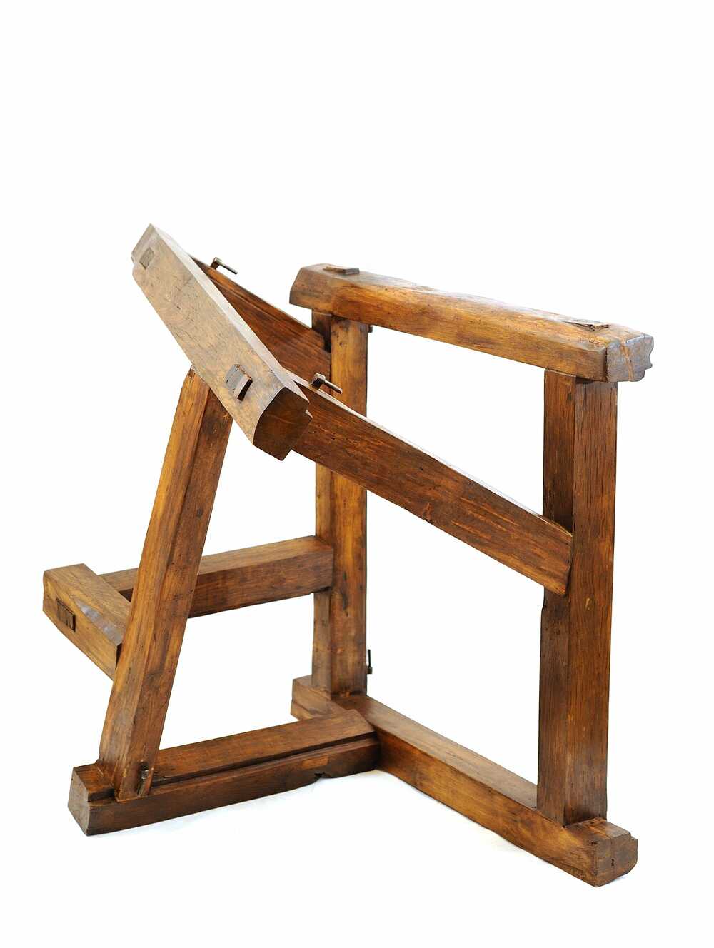 De estilo abstracto. Material compuesto por madera de roble. Roble procedente de marcos de ventanas incluidos los pernios. Se han ido ensamblando marcos completos con incompletos sujetos con espigas y cajetines encolados. La madera está lijada y encerada.