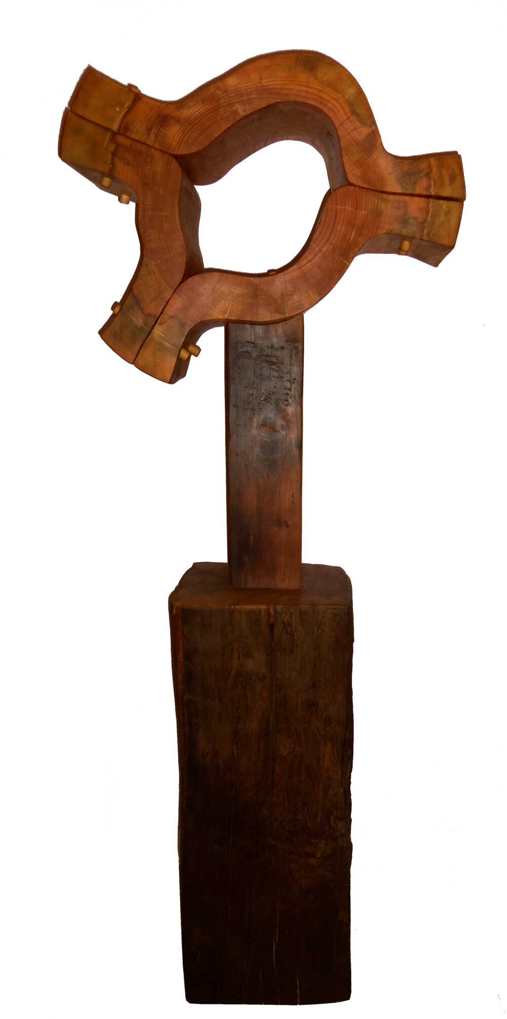 De estilo abstracto se utiliza para su composición roble antiguo y conÃfera sin determinar. Formado por una base pesada y un vástago que sujeta la parte principal, está formada a partir de un tronco de conÃfera vaciado en su interior y cortado en curvatura en tres trozos. Con posterioridad se unen con tubillones de haya.