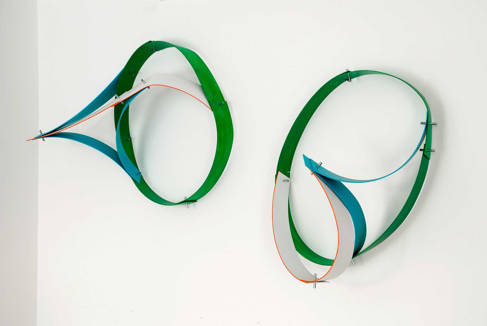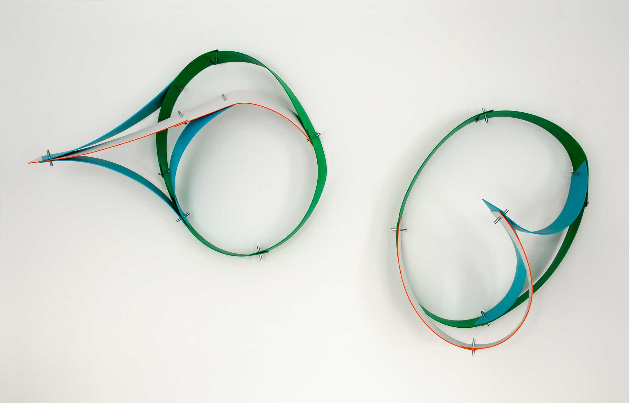 Die Objekte haben kein Oben und kein Unten und können beliebig herum gehängt werden, wodurch der Eindruck entsteht, als hinge immer wieder ein neues Objekt (Gesamtform) an der Wand, obwohl die Struktur immer die gleiche ist.