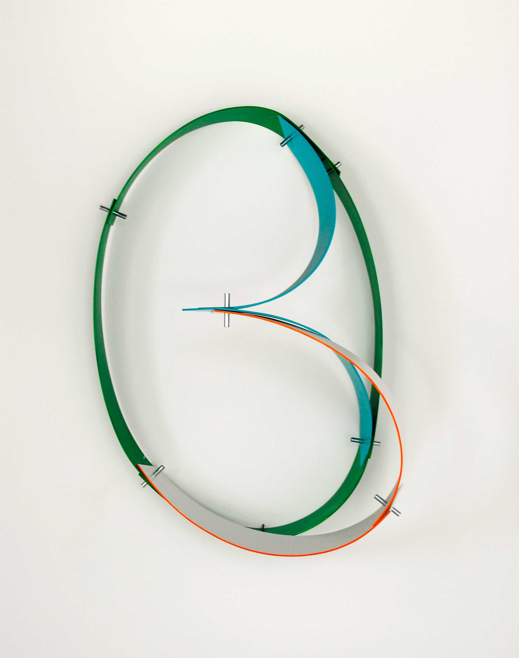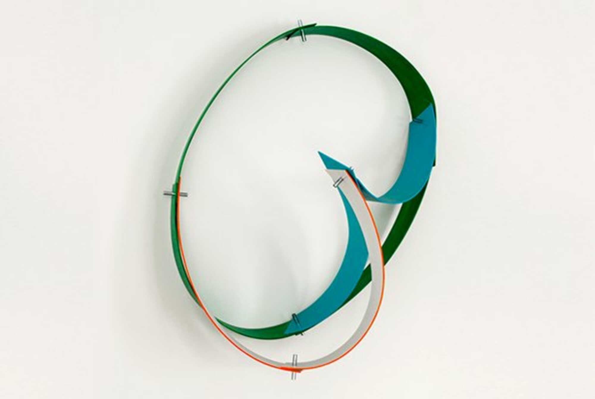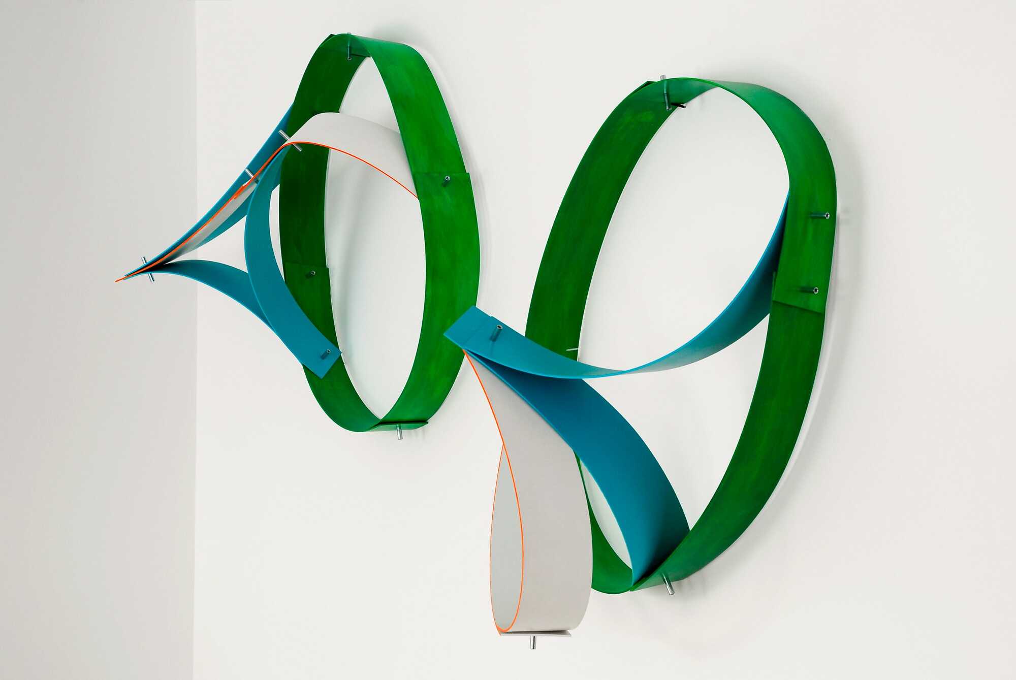 Die kühlen weißen Streifen mit den orangefarbenen dünnen Kanten kontrastieren mit den grünen Streifen, die der Skulptur einen frischen und dynamischen Ausdruck verleihen.