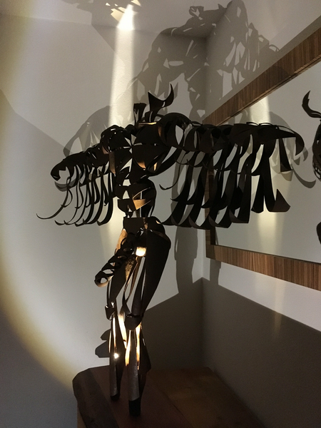 Skulptur steht auf einer Kirschholzplatte von welcher aus sie beleuchtet ist.