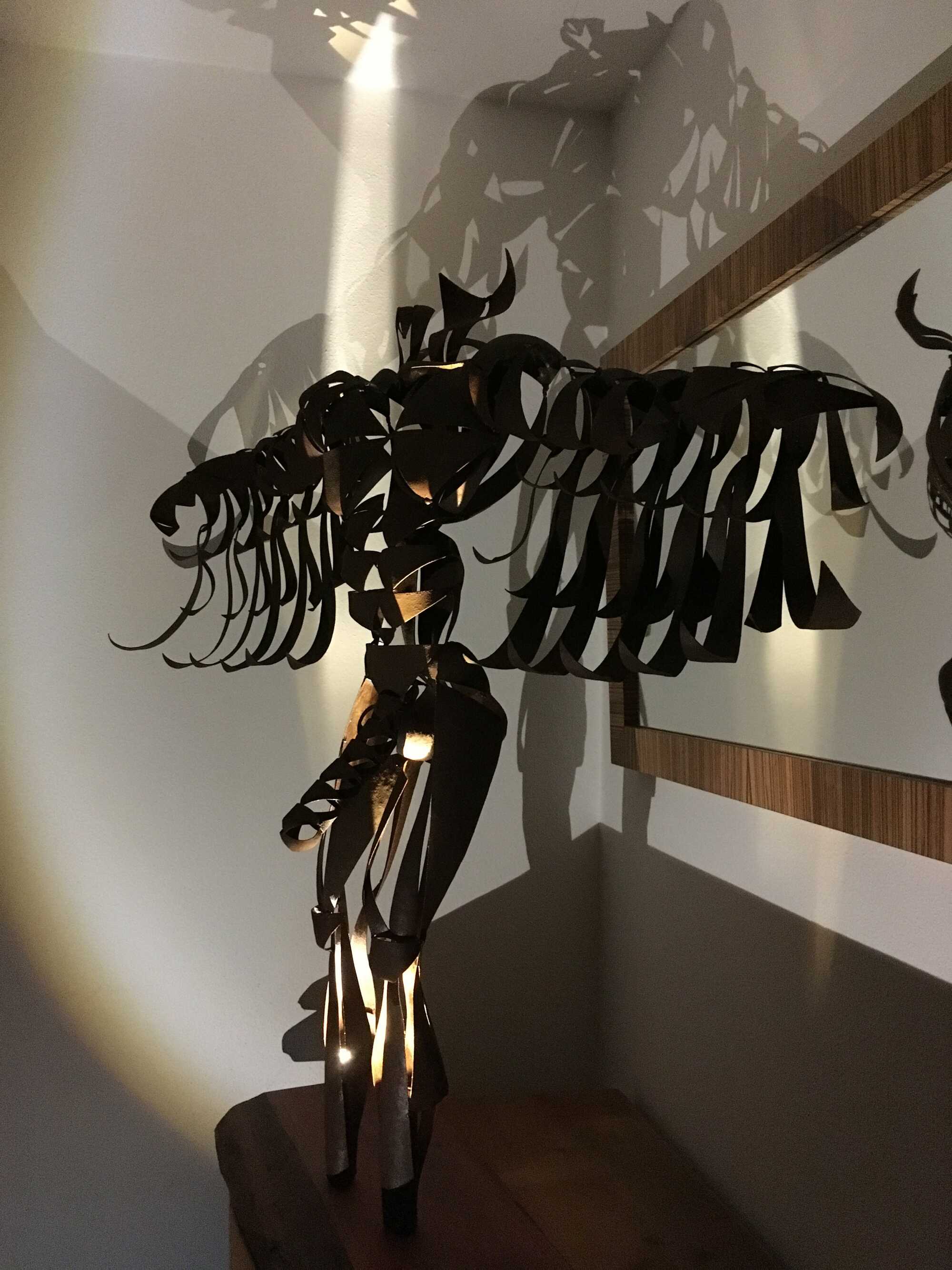Sculptur stands on a Cherrywood board and light shines from the bottom to the top.
