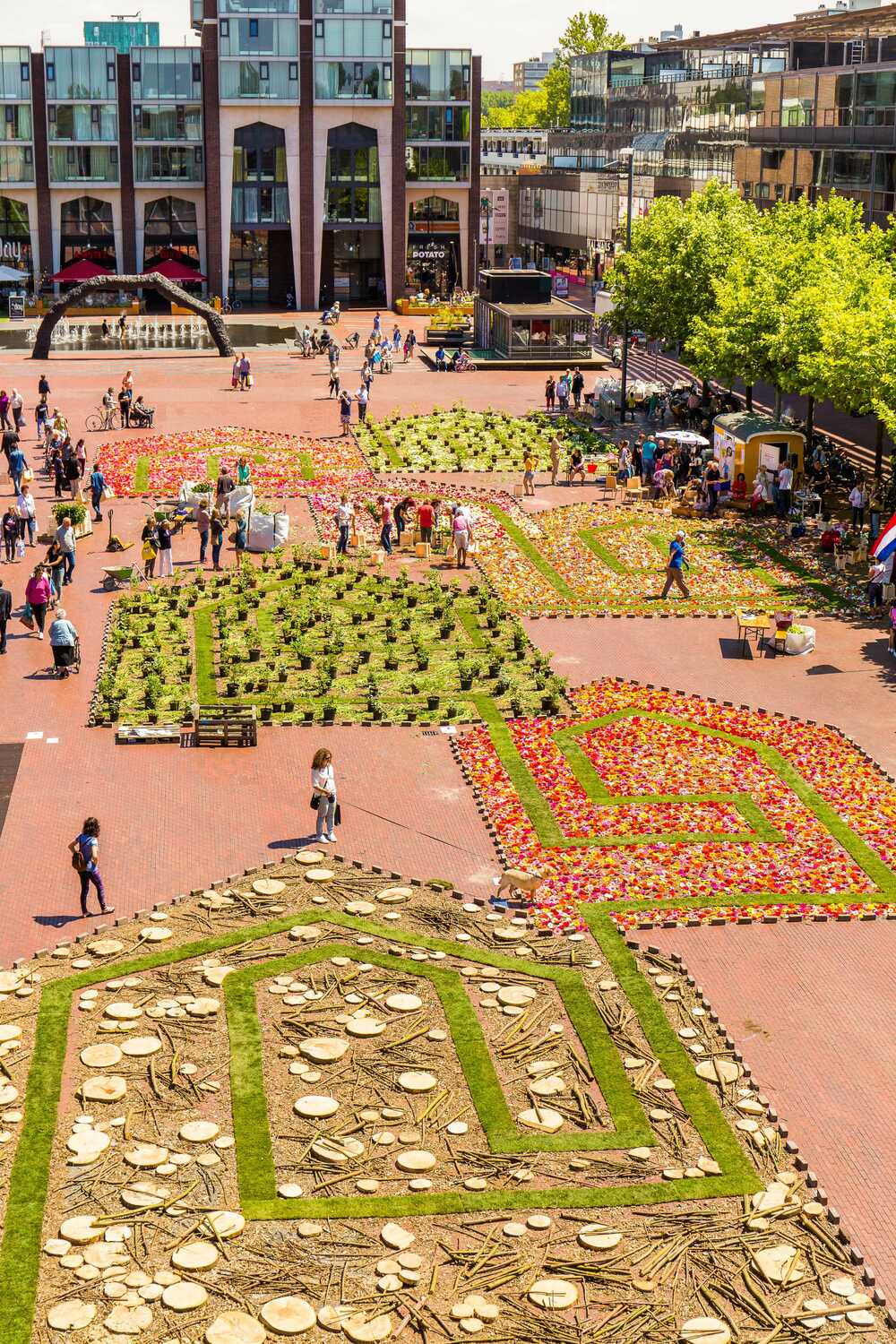 The installation was created through the collaboration of participants from Amstelveen, Lima and Berlin. Together with Rhode they erected and built a maze in the main square of Amstelveen, which they could then walk through. This labyrinth did not have any high divisions but was designed on the floor of the square with flowers and plants. It was an art project that existed for 24 hours and visitation was therefore also possible at night. The labyrinth was made up of more than 20.000 flowers, plants and paths made of grass. After nightfall with small lights alongside its edges of the shape of the houses. People of all ages helped to create the labyrinth.