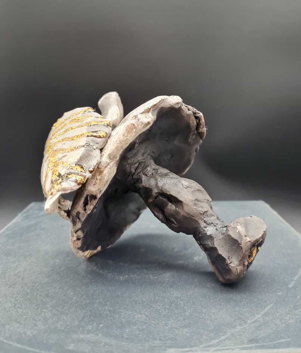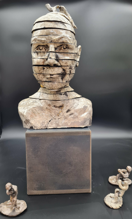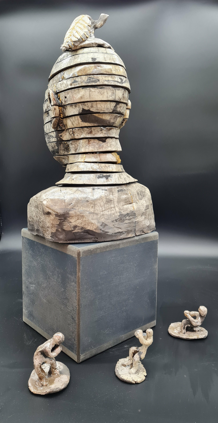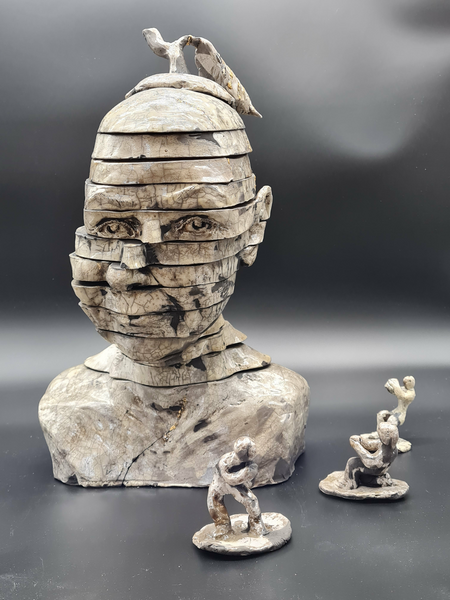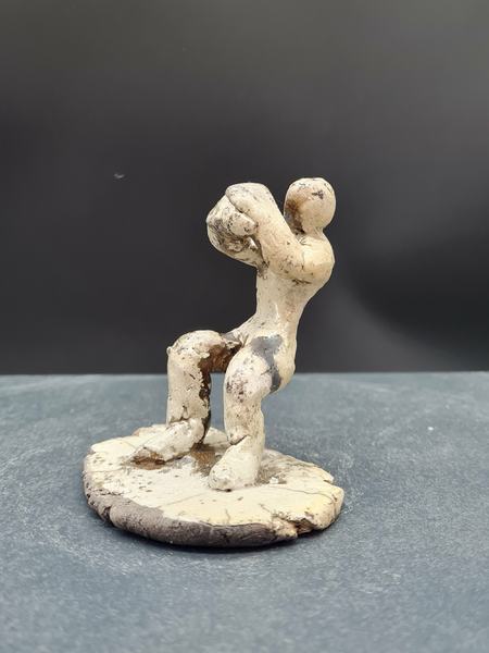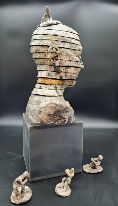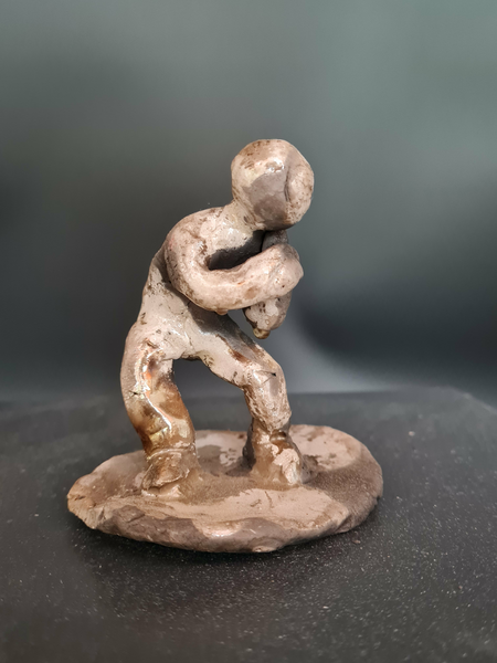 Einzeln gebrannte Teile, ineinander verschieb- und stapelbar, die kleinen Figuren versinnbildlichen-die ziehenden und zerrenden Sorgen, Ängste und Regeln, von denen man sich verformen lässt.