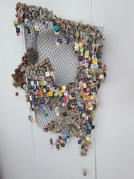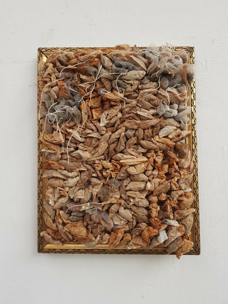Used teabags have been part of my work since 2010. Used and reused am I intrigued by the fragility and cushion like appearance. Since I reuse and even misuse those, I play with the meaning of those words: used, reused, misused, abused. Therefore I combine teabags with other materials whenever I feel something is used in an unhealthy way.