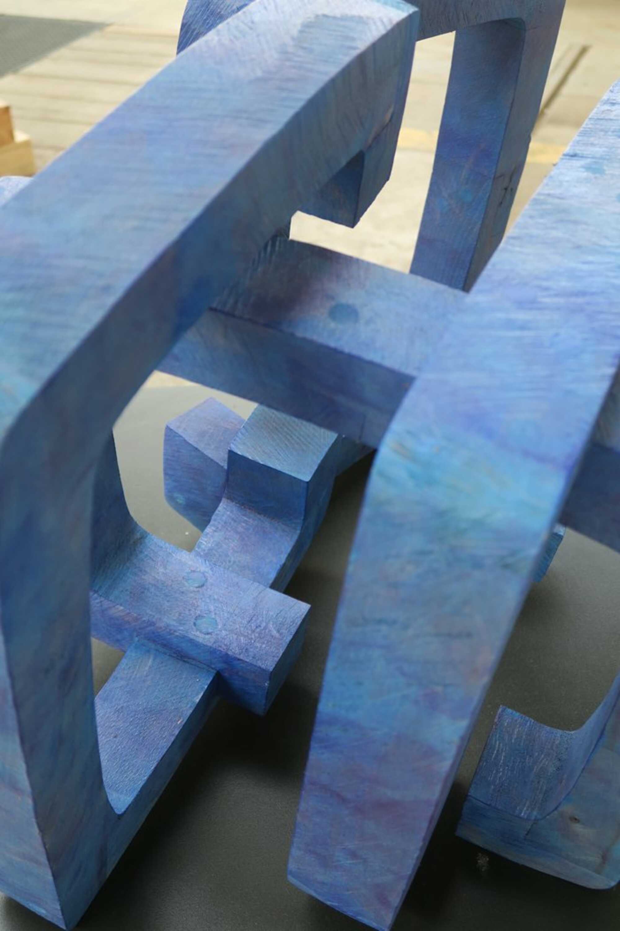Buchenkantholz verleimt und verdübelt; mit mehreren transparenten Schichten blau eingefärbt.