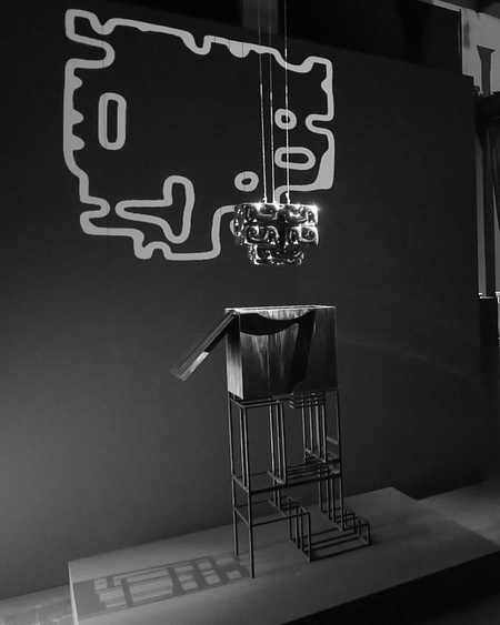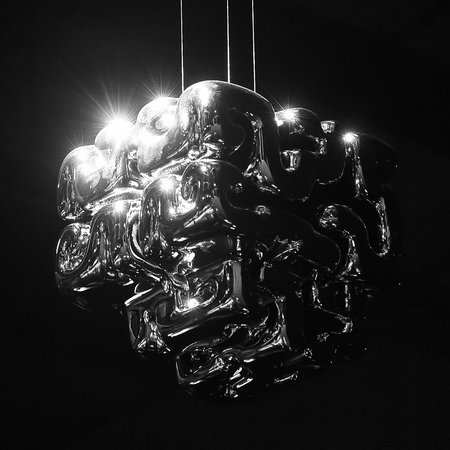 The installation is composed by a body, which quotes Auguste Rodin's "Le Penseur", a chromed brain on the verge of soaring and a video projection representing a journey inside the brain itself.