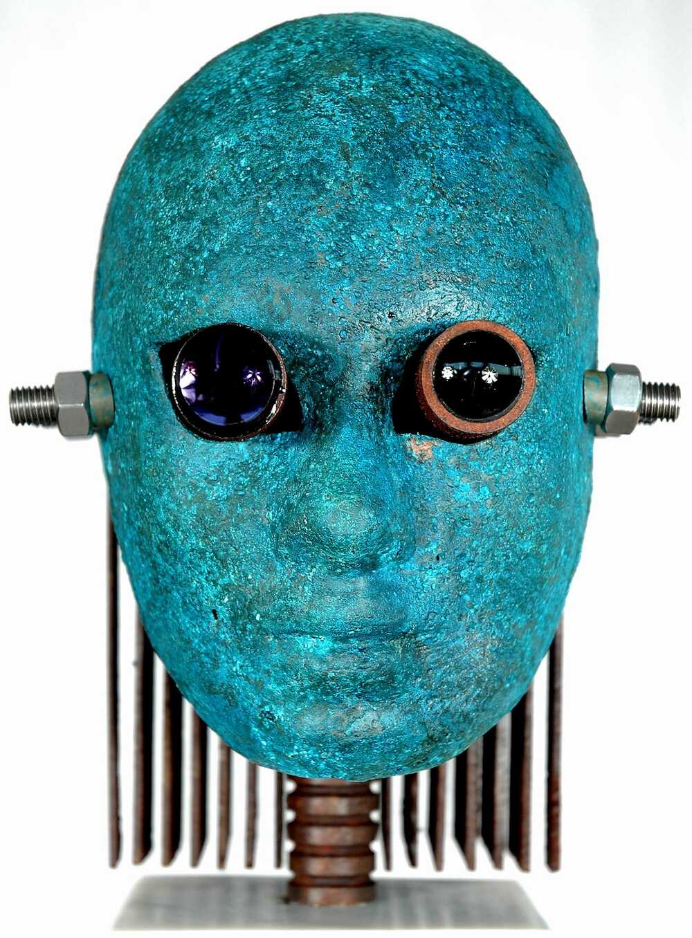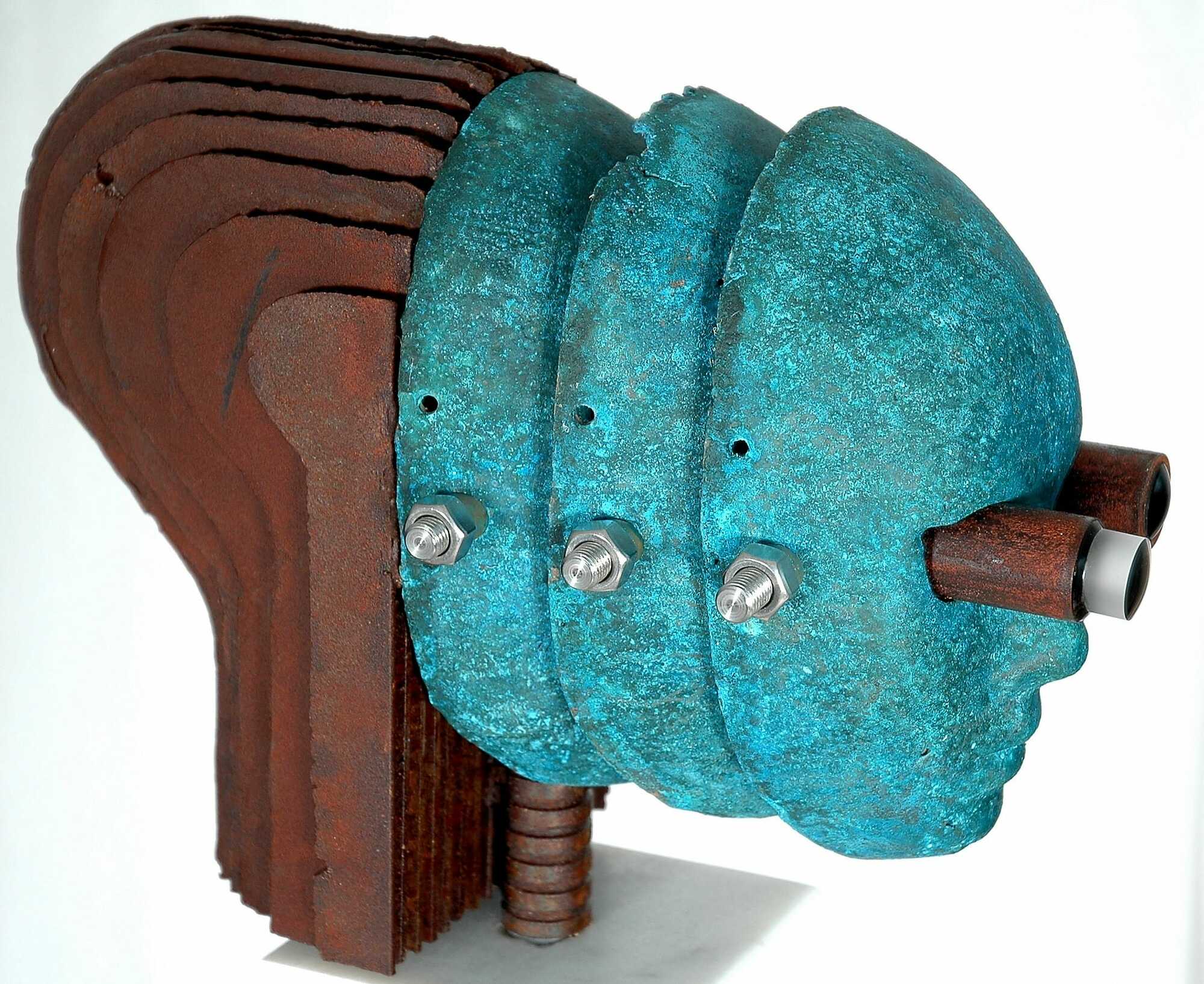 Cast, patinated copper, corroded steel, optical elements, fasteners