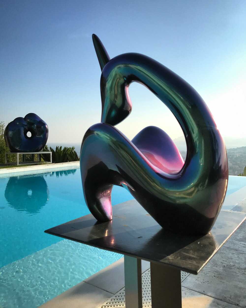 Carbon fibre, changeant colours, from graphite through blues, pinks, purples and turquoise.