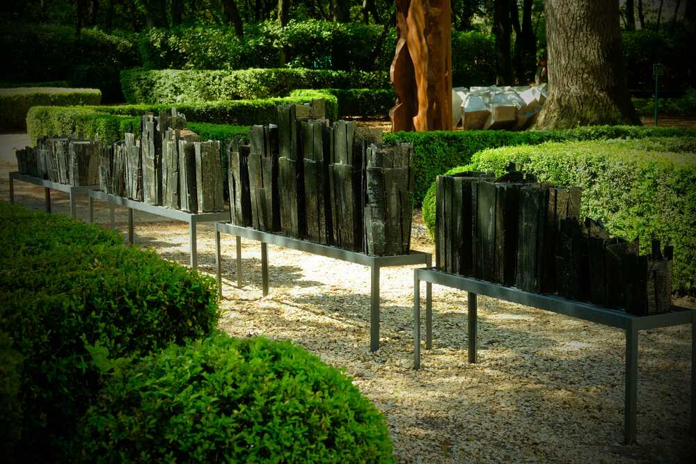 Mise en scène, suivant la ligne médiane d'un chemin et reflétant en même temps les ombres des buis environnants.