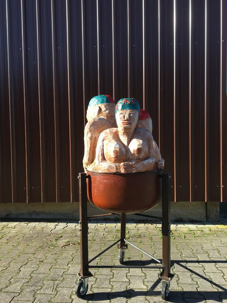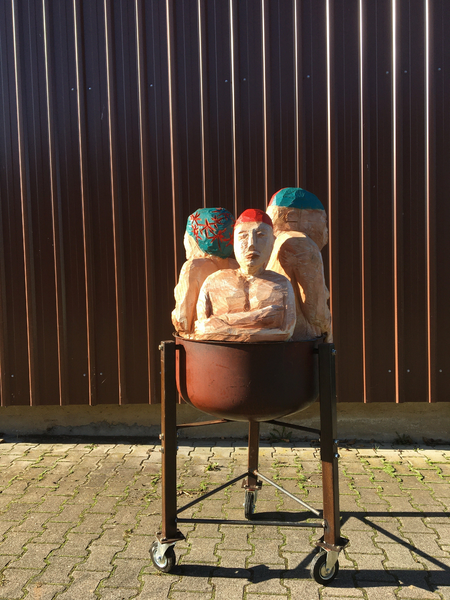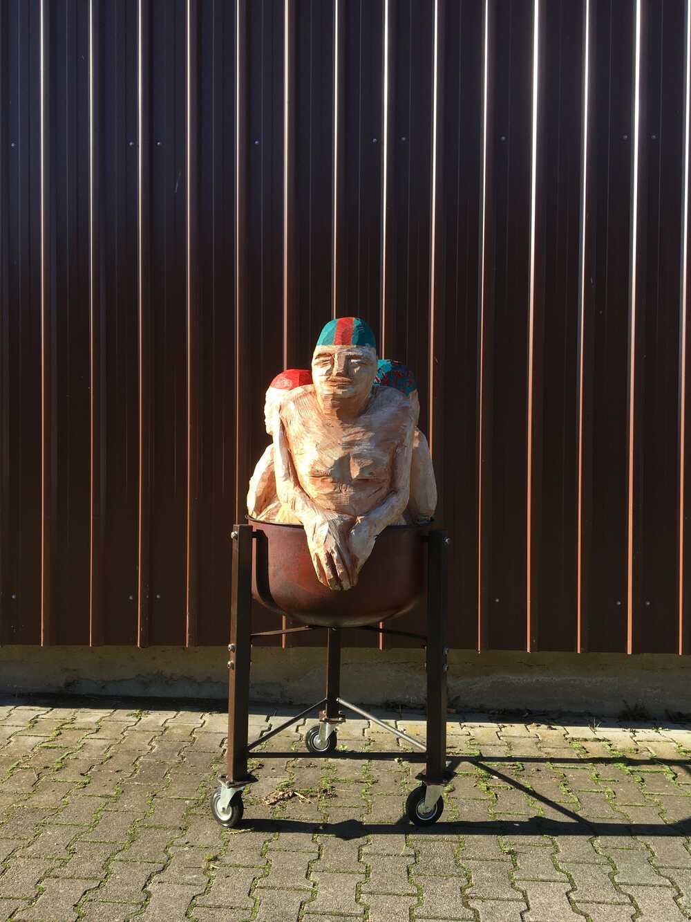 Skulptur aus Eiche 3-teilig in Metallbottich