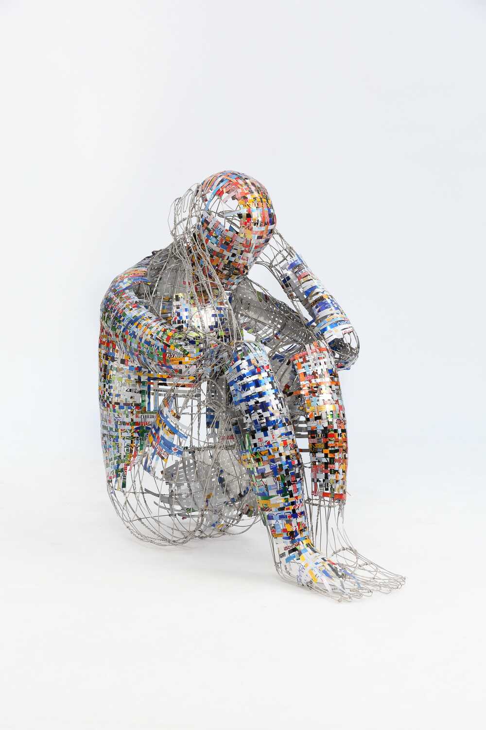 This piece has a double narrative. As we become more aware of mental health issues this could be construed as something deeper, hence the name Nemesis. The incomplete covering of skin is a deliberate reference to ailments known to be caused by sugar and alcohol, both normally found in these bright, shiny jewels of soda cans carefully designed to be eye catching and attractive. The hidden consequences are the unspoken horrors caused by these sugary treats, everything from Alzheimer's to diabetes to amputations, cirrhosis, cancers and mental health issues.