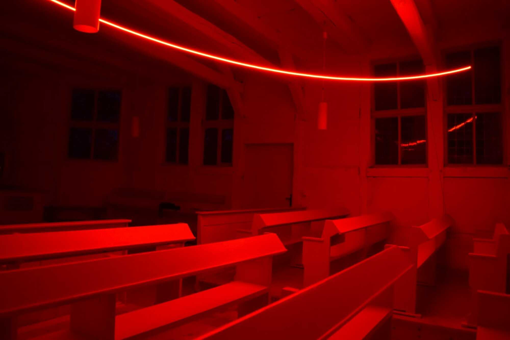 the thin red line / die rote Linie, der schmale Grat. 2021 Installation Dorfkirche Meierstorf