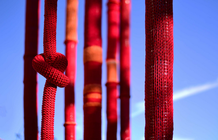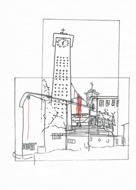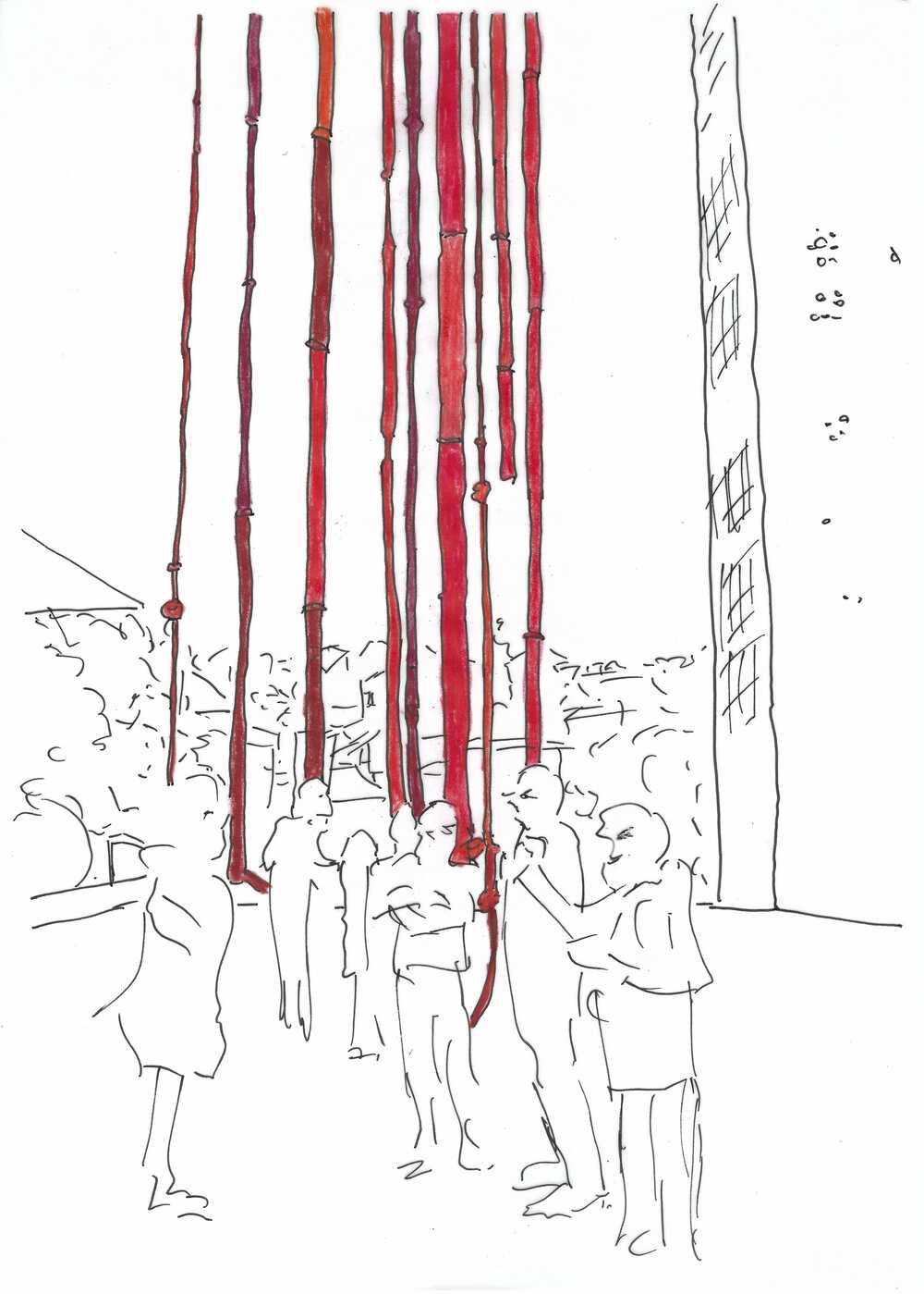 'daZWISCHen' schwebt als Säule über dem Kirchenplatz Maihof, Luzern, wo sich Menschen begegnen. Es ist ein Spiel von roten, gestrickten Schläuchen, die sich, Wind und Wetter ausgesetzt, verändern. Sie wiegen sich im Win, bleichen an der Sonne und wachsen bei Regen gen Boden. Da - dazwischen - zischt.