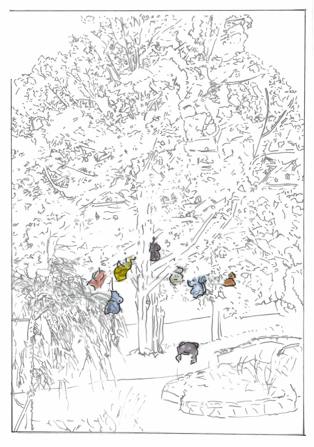Wer jedoch den Garten betritt und den von Vera Staub geschmückten Baum näher betrachtet, erkennt, dass es sich bei den vermeintlichen farbigen Ballons in Wahrheit um neun Nachbildungen schwangerer Bäuche aus Gips und Epoxy handelt. Sie weisen unterschiedliche Formen, Grössen und Positionen auf, gemeinsam ist ihnen aber, dass sie hohl bzw. leer sind. Die Entstehung von etwas Neuem stellt hier sogleich auch die Frage nach seiner konkreten Ausgestaltung: Was genau in jedem dieser Bäuche heranwächst, bleibt offen.