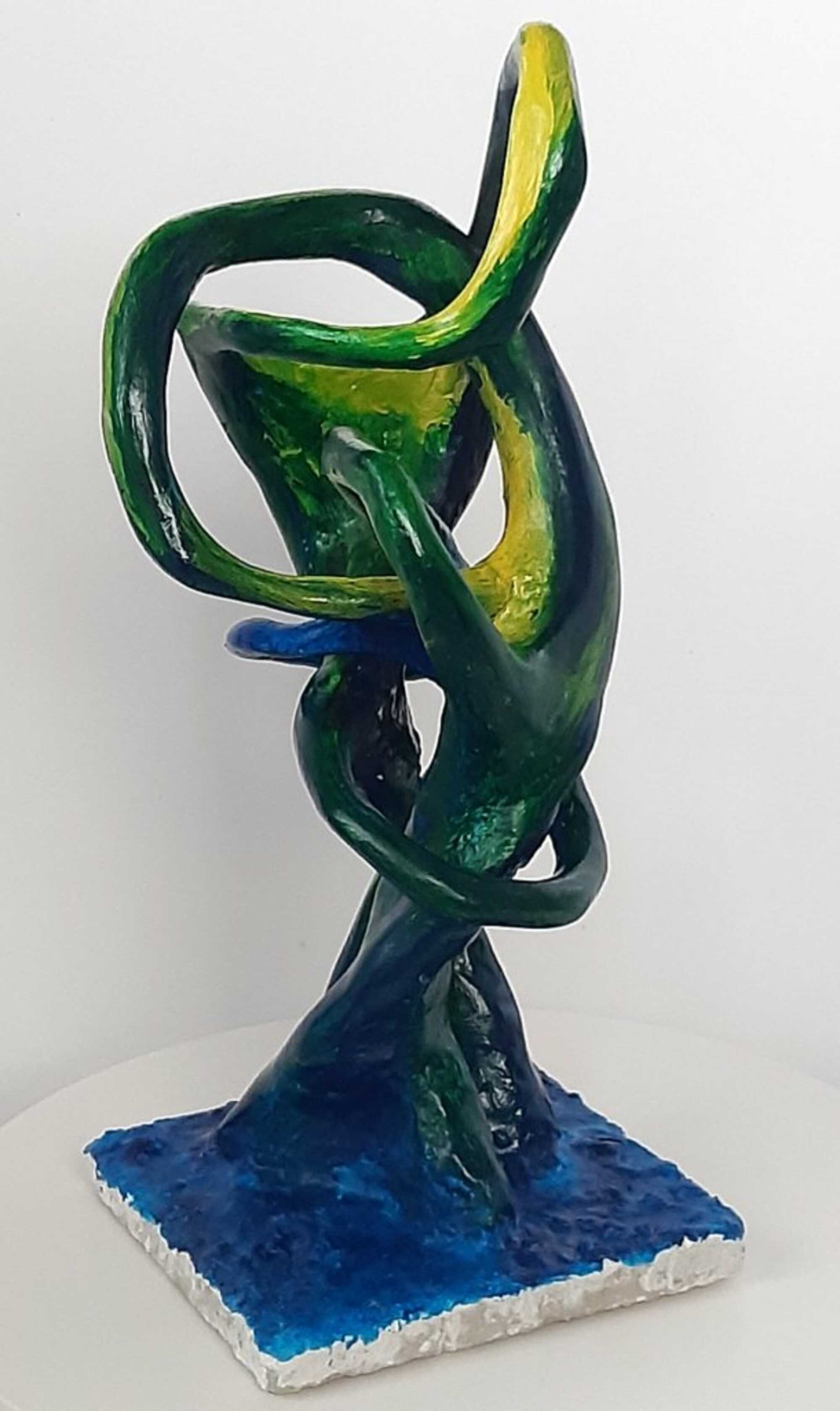abstract sculpture modelled in mortar, painted with acrylic paints in blue, green and yellow, with a glossy finish.