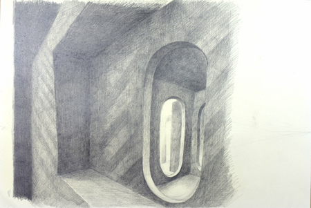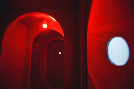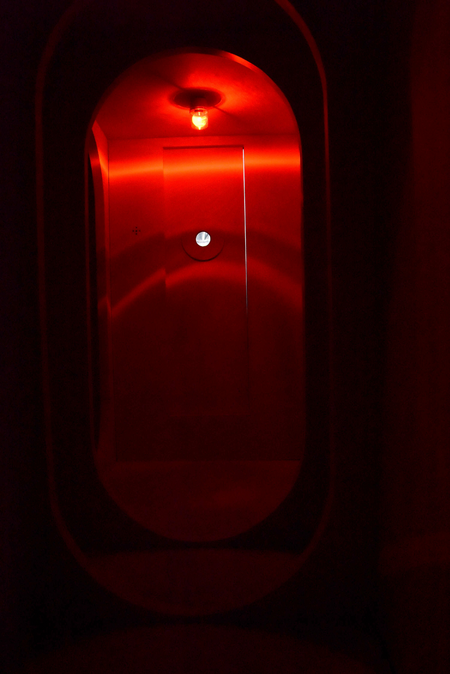 A further idea referenced in the installation is the idea (rather than the actuality) of the space-station, and speculation on how anyone could cope with an existence forever contained within an endless interior. Maybe memory would begin to take over, and the ghosts of the past would materialise in the corridors. Such contained interiors are spaces that become divorced from connection to anything except what is within, and there is here a connection to Earth bound contained interiors. A specific film is referenced here, but I will leave you to guess which one…