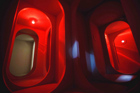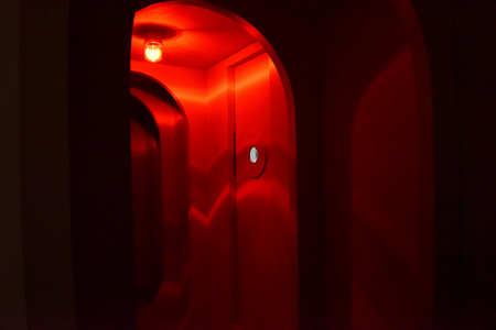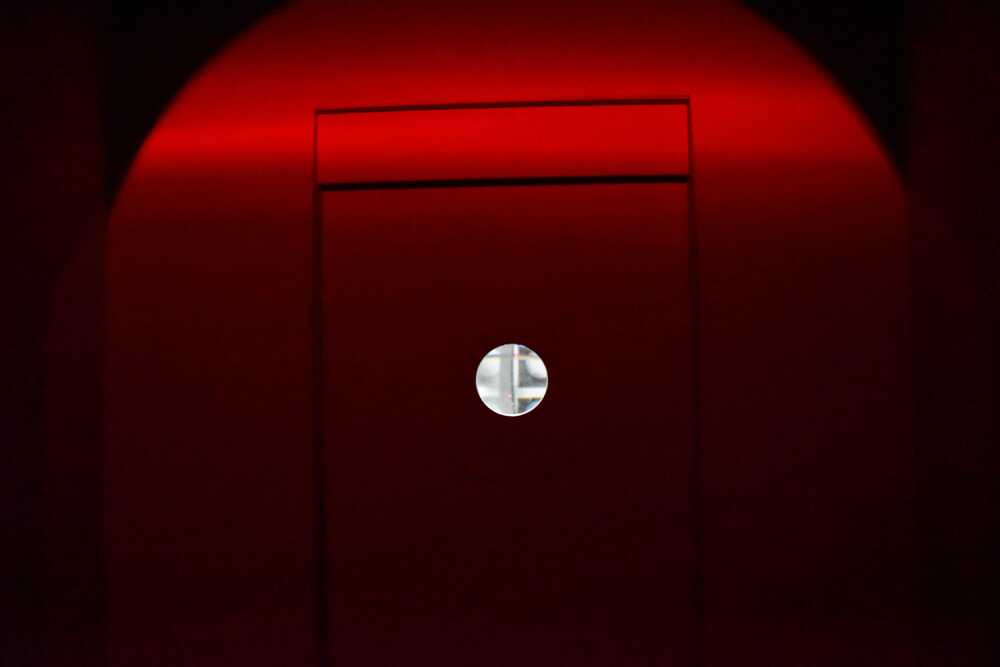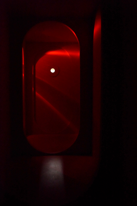 An installation of corridors, doorways, flashing lights and sound - a low rumble and a voice intoning a series of numbers.