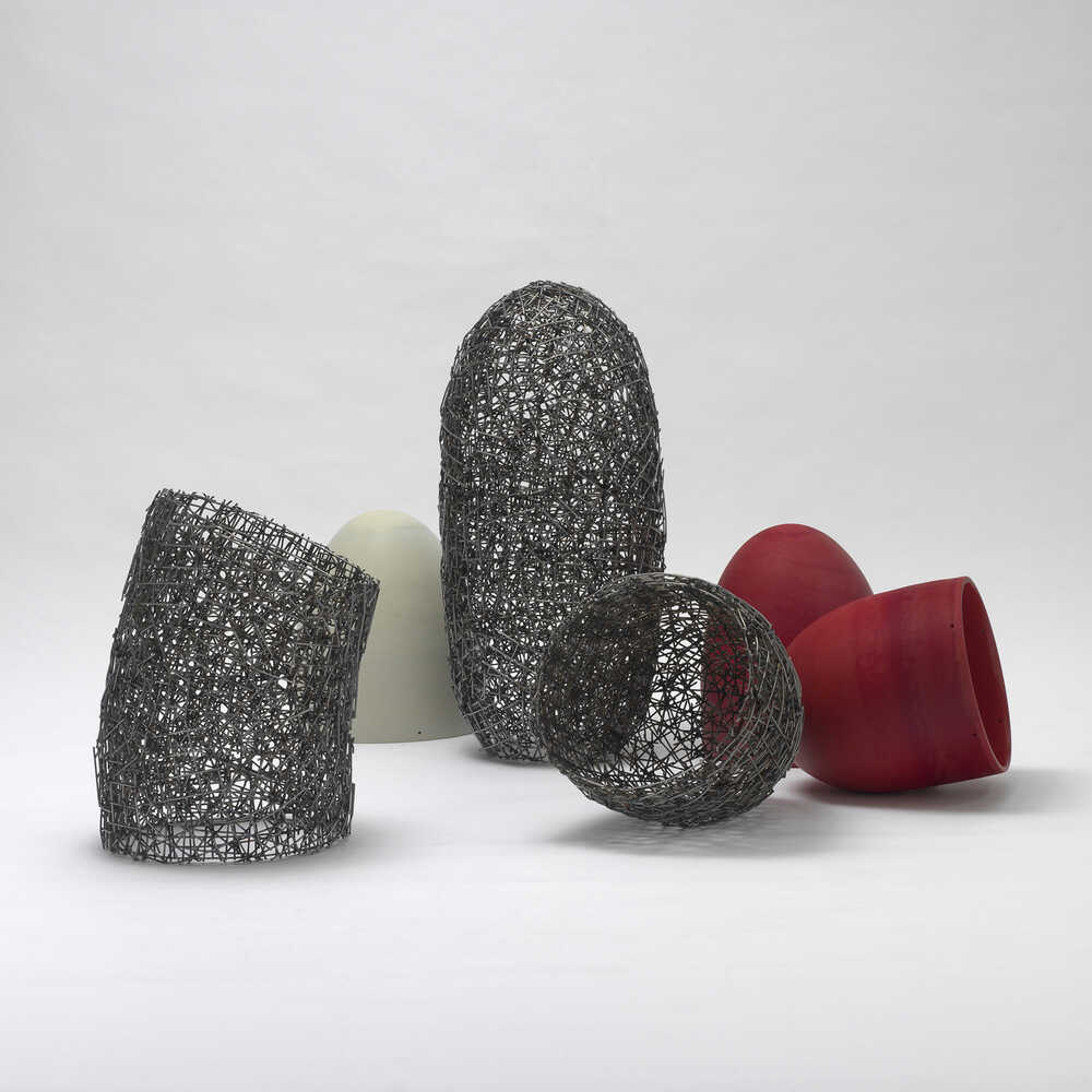 Media: Glass, free blown and structured, and welded steel. "Eva Moosbrugger explores the different properties and perceptions of the material she uses. The coloured glass looks like marble or pottery, while the steel is worked in such a way as to provide transparency, light and shade - properties which are otherwise associated with glass. This interplay calls into question established habits, things we take for granted and the casual, careless way we treat nature, life and health." Cit. Dr. Sven Hauschke in ISBN 978-3-7954-2854-9