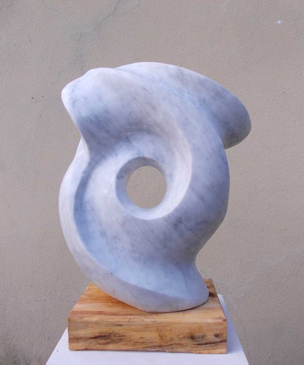 "Source" is an abstract white marble sculpture with a round hole in the centre. It's inspired by flow forms of water. But the hole is also like a symbol of the sun. Both, water and sunlight are sources of life