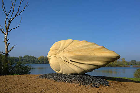 Die stilisierte Form einer Flussmuschel ist ein Verweis auf die Wasserqualität und Artenvielfalt am Großen See bei Breitengüßbach. Sie verkörpert Ursprünglichkeit und ist gleichzeitig Sinnbild für das Unbekannte, Geheimnisvolle und Neue. "Archaika" entstand auf dem internationalen Bildhauersymposium "Flussgesichter am Obermain".