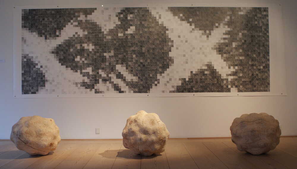 Seeds (wood), background: 3780 variations over grey (pencil on paper)