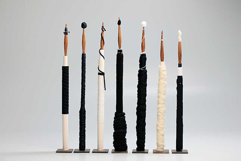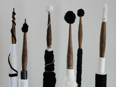 Stelengruppe aus alten Spindeln, Ton, Wolle, Perlen, Metallständern