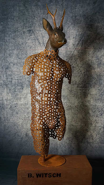 aus Stahlscheiben verschweisst mit Rehbockkopf geschnitzt um 1900