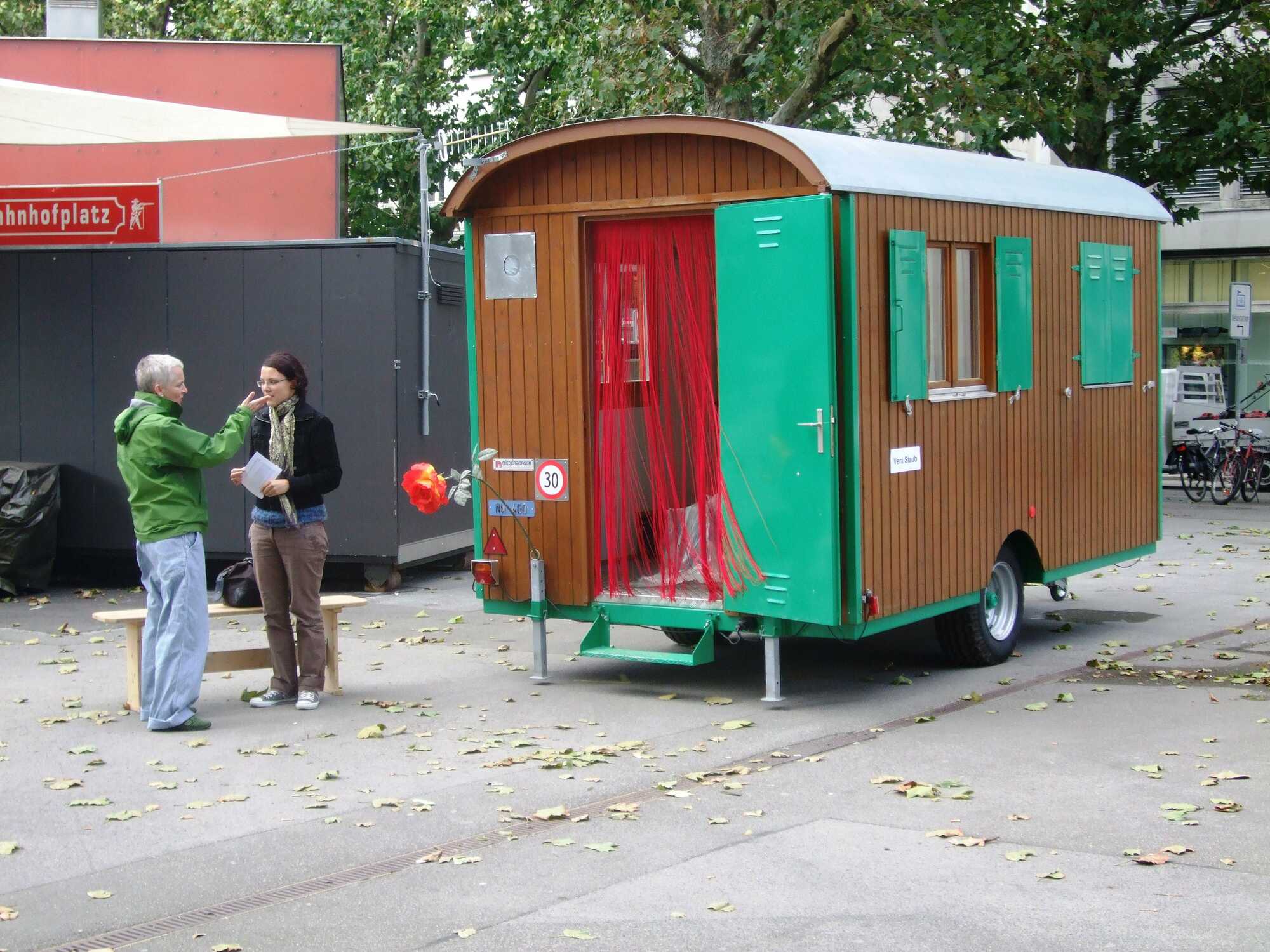 Romperemos un Pilar'Wanderausstellung mit Zirkuswagen