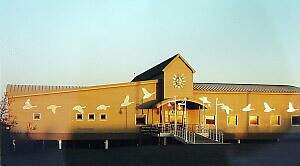 Yupik Spirit building art design Design on the Eskimo Civic Center in Bethel-Alaska INFO in German view: http://metalart.alotspace.com/maskg_files/maskg.htm -----------Homepage Artist Mirko Siakkou-Flodin: www.mo-metallkunst.de -----------------artist concept: Visiting Bethel during the Camai Festival, 1996 and inspecting the proposed building "Yupiit Piciryarait" including the exhibition of Agayuliyaraput- The Living Tradition of Yup'ik Masks, followed by intensive study of Eskimo culture in the library of Nunapitchuk, guided me to this artistic conclusion which fuses the main ideas of Eskimo life and their understanding of the relationship between humans and nature. Y'upik MaskThe mask I have created is a traditional design from this area. It includes the meaning of spirit and soul of the universe and stars, and the significant understanding represented by the holes in the hands to signify the spirit's compassion for the animals. The spirit of the mask is allowing some of the animals he hunts to successfully slip through his palms and return safely home. The migrating geese traveling north to south through the Kuskokwim Delta are passing by the proposed mask. To represent this idea of compassion for the hunted animals, there are 6 geese on the left of the building area of "A2" but only 5 on the rights side "A1". Thus only 1 goose is caught and the others are allowed to pass through. This proposal binds architect Tom Livingston's architectural design of the front facade together like a banner. Aluminum was chosen as the material because of its lightness (for mounting on the facade) and durability against corrosion. The natural gray oxidation color is close to the geese's natural colors and the structure will make transportation to Bethel as easy as possible, thus responding to Livingston's call for "appropriate technology" for Arctic architecture in Alaska