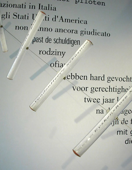 A steel wire stretched from the ground to the wall in an ascending line is dotted with twenty glass tubes, each containing a piece of rice paper. Written on each sheet is the name of a person and the words “Place and date of death Cavalese Feb 1998.” The wire and tubes are accompanied by wall text describing an accident that took place near the small village of Cavalese, Italy in 1998.