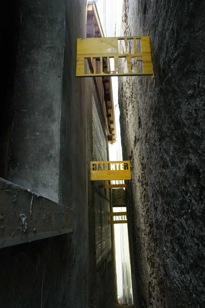 Temporary installation in a narrow gap between traditional houses (Kunstwege Vias d'Art Puntraschigna, Pontresina)