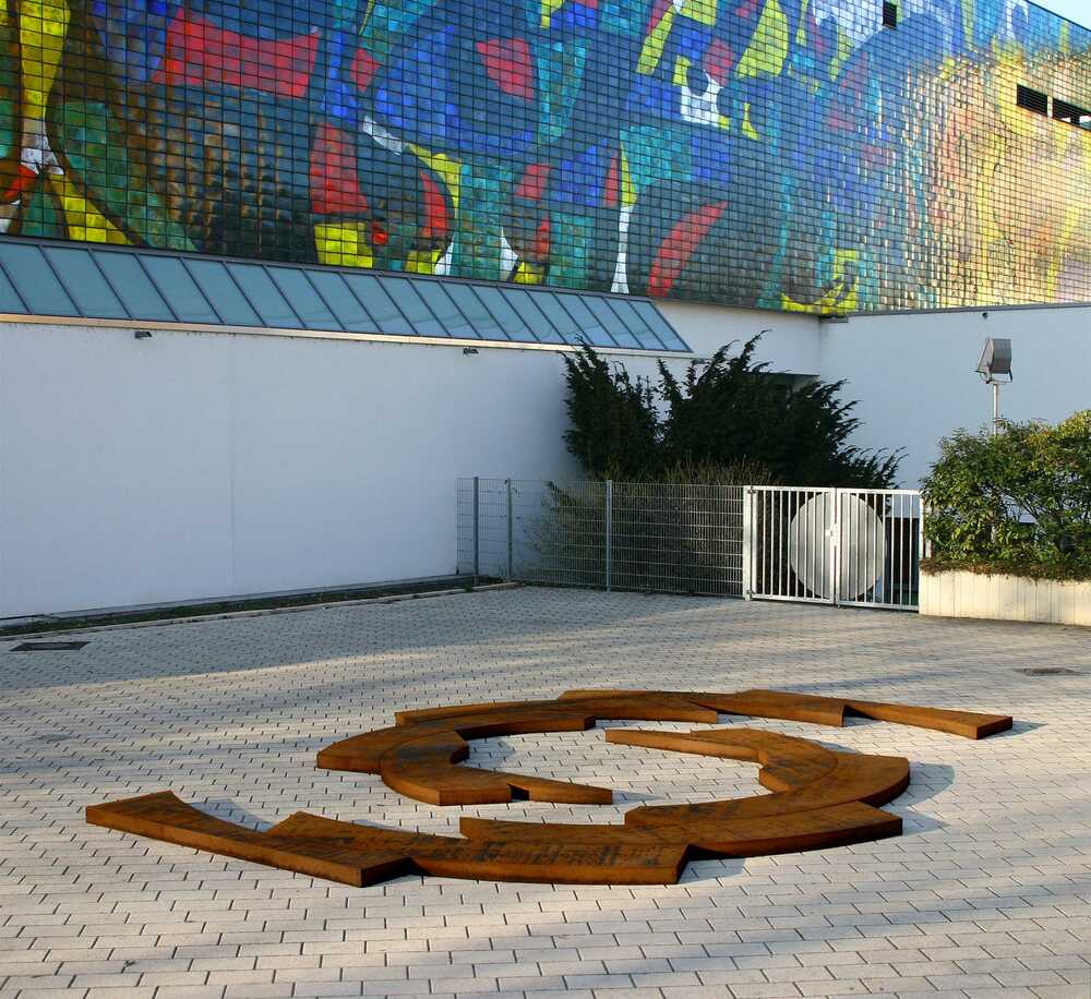 Singularität, 2 x 6 Segmente, Zwillingsbodenskulptur, Stahl 100 mm, seit 2012 vor dem Wilhelm-Hack-Museum Ludwigshafen unter der Miro-Wand