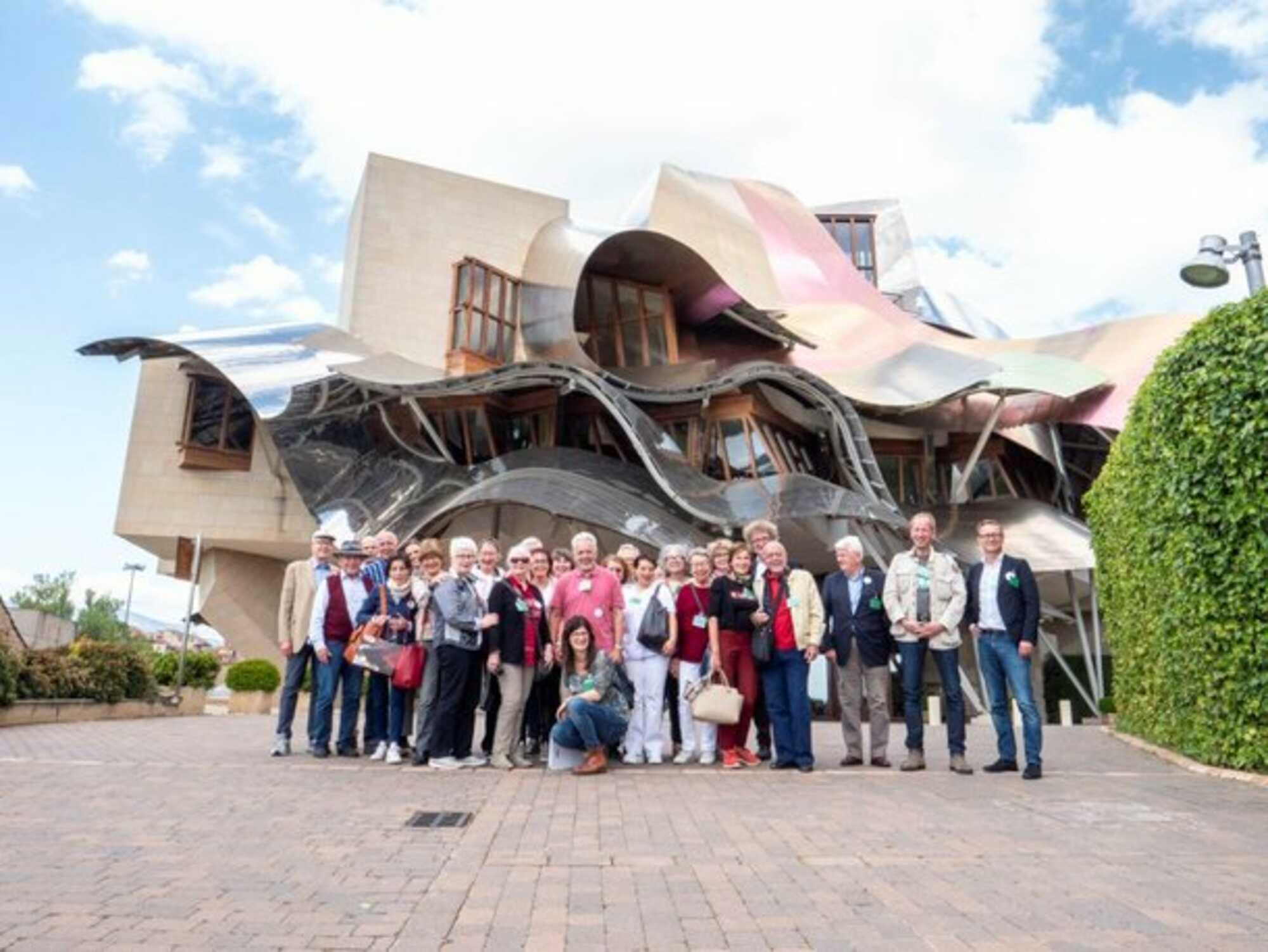 Auf einem Abstecher in die Weinregion La Rioja stellte die Gruppe fest, dass die Weingüter der Region ihr eigenes Wunder von Bilbao erleben. Sie setzten schon vor zwanzig Jahren auf Stararchitektur – ohne zu ahnen, welchen Trumpf fotogene Wahrzeichen-Architektur in der Instagram-Ära darstellt. Santiago Calavatra baute im Auftrag des Pernod-Ricard-Konzerns für das Roja-Weingut Ysios inmitten der Weinberge bei Guardia ein spektakuläres Kellereigebäude. Wie eine Fata Morgana flimmert das langgezogene Gebäude mit seinem wellenförmigen Aluminiumdach und seiner gewellten Fassade aus Zedernholz in der hügeligen Landschaft. Die majestätische Kanzel im Zentrum des Baus hat fast sakrale Wirkung. Sie könnte auch von einem Schiffsbug inspiriert sein, der durch die Wogen des Meeres pflügt.