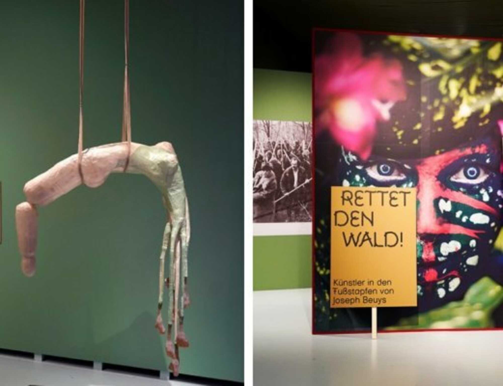 Save the Forest, Ausstellungssicht Museum Het Valkhof, NL with Uýra Sodoma, Poder de Tajá, 2020 und Joseph Beuys, Rettet den Wald!, 1971. Foto Flip Franssen