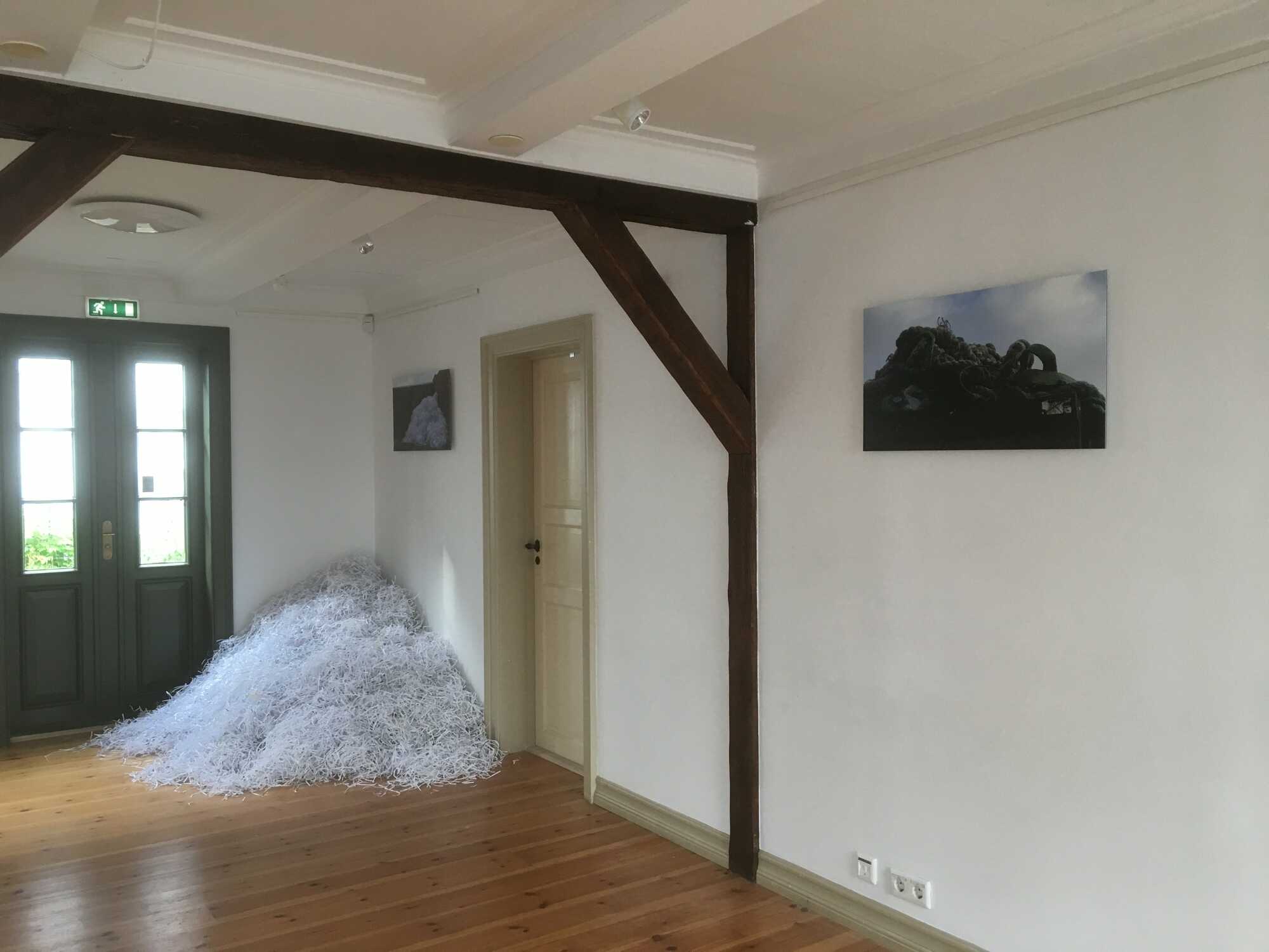 In recent years Gudrun Nielsen has been aware of slow but constant changes in the immediate surroundings of her studio in Gufunes. The site is one of Iceland’s leading providers of environmental management services and clean energy. Scrap of mostly timber and plastic piles up, the outcome being manmade mountains that only stay for a while within the city landscape before changing or disappearing.