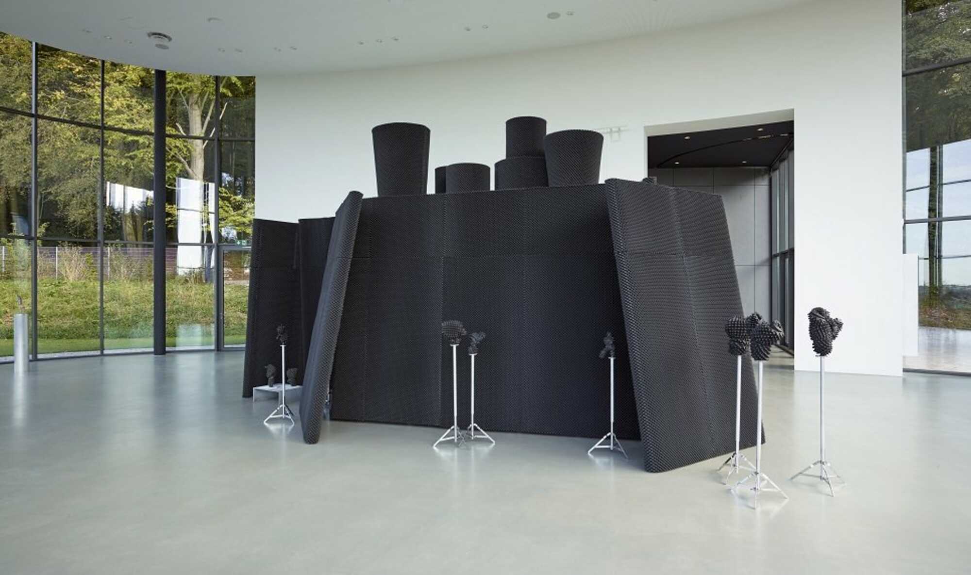 Verbunden jedenfalls ist diese Werkgruppe in ihrer nun erstmaligen Präsentation, aufgeständert auf stativartigen Hilfskonstruktionen. Als ambulantes Ensemble scheinen sie es geradezu darauf anzulegen, je nach Erfordernis neu gestellt und sortiert zu werden – ähnlich einem Orchester, das es abhängig von der aufzuführenden Musik im Studio oder auf der Bühne immer anders zu arrangieren gilt. Jedoch stehen die Skulpturen nicht losgelöst am Ausstellungsort, sondern sind in Bezug gesetzt zu einem monumentalen und voluminösen kubischen Gehäuse im Raumzentrum, das ohne Öffnungen vollständig mit schwarzen Akustikmatten überzogen ist. Daran lehnen ebenso verkleidete übermannshohe Schallwände. Wie beiläufig abgestellt bilden sie umlaufend eine spannungsvolle dreidimensionale Erzählung aus Kompartimenten, Nischen, Verstecken. Dorthinein sind die kleinen Arbeiten platziert und beleben einem Tableau Vivant gleich die gesamte Inszenierung. Dass sich die Oberflächen der Güsse, des Gehäuses und der Schallwände augenfällig entsprechen, wenngleich sie doch ganz verschieden sind, führt zu einem irritierend sinnlichen Kurzschluss von Vorder- und Hintergrund, der die lineare Vorstellung von Raum und Zeit unterbricht. Wer begegnet hier eigentlich wann wem? Oder erscheint das eine nur im Spiegel des jeweils anderen? Reflexion wird zu einem Klappmechanismus der Beobachtung: die mögliche Verkehrung von Vorbild und Abbild, also eine sich widersprechende Tautologie ... kurzum, ein stetiger Regress, wie das Leben selbst.