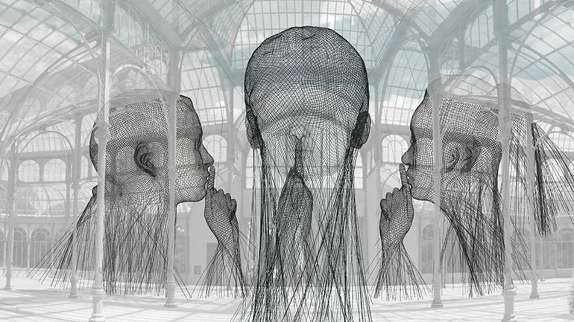 In this instance, the invisible forms the essence of his intervention in the Palacio de Cristal: a group of steel mesh sculptures which take the space to draw the incomplete faces of figures hanging in the air, intersected by light and suspended in time. Â