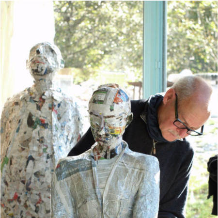Unter Verwendung von Altpapier gestalten wir bis maximal lebensgrosse, künstlerische Objekte oder Figuren nach Ihrer Vorstellung. Die Skulpturen bestehen aus einem Holz- oder Drahtgerüst und dann ausschliesslich nur aus "Papiermüll" und werden nicht bemalt. Die Farbigkeit, zum Beispiel die Muster der Kleidung, kommt zustande, indem man bedrucktes Papier so geschickt auswählt, dass es wie eine Bemalung wirkt.