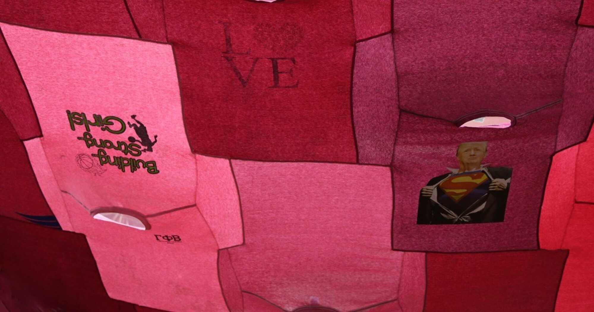 Creating a patchwork of slogans, aspirational, commercial and political, the T-shirts also act as repositories of cultural information forming a snapshot of collective consciousness. Collaged together the diverse and polarized statements and imagery people choose to emblazon on their bodies offers a telling reflection of the social and political allegiances and binaries that define our contemporary moment.Â