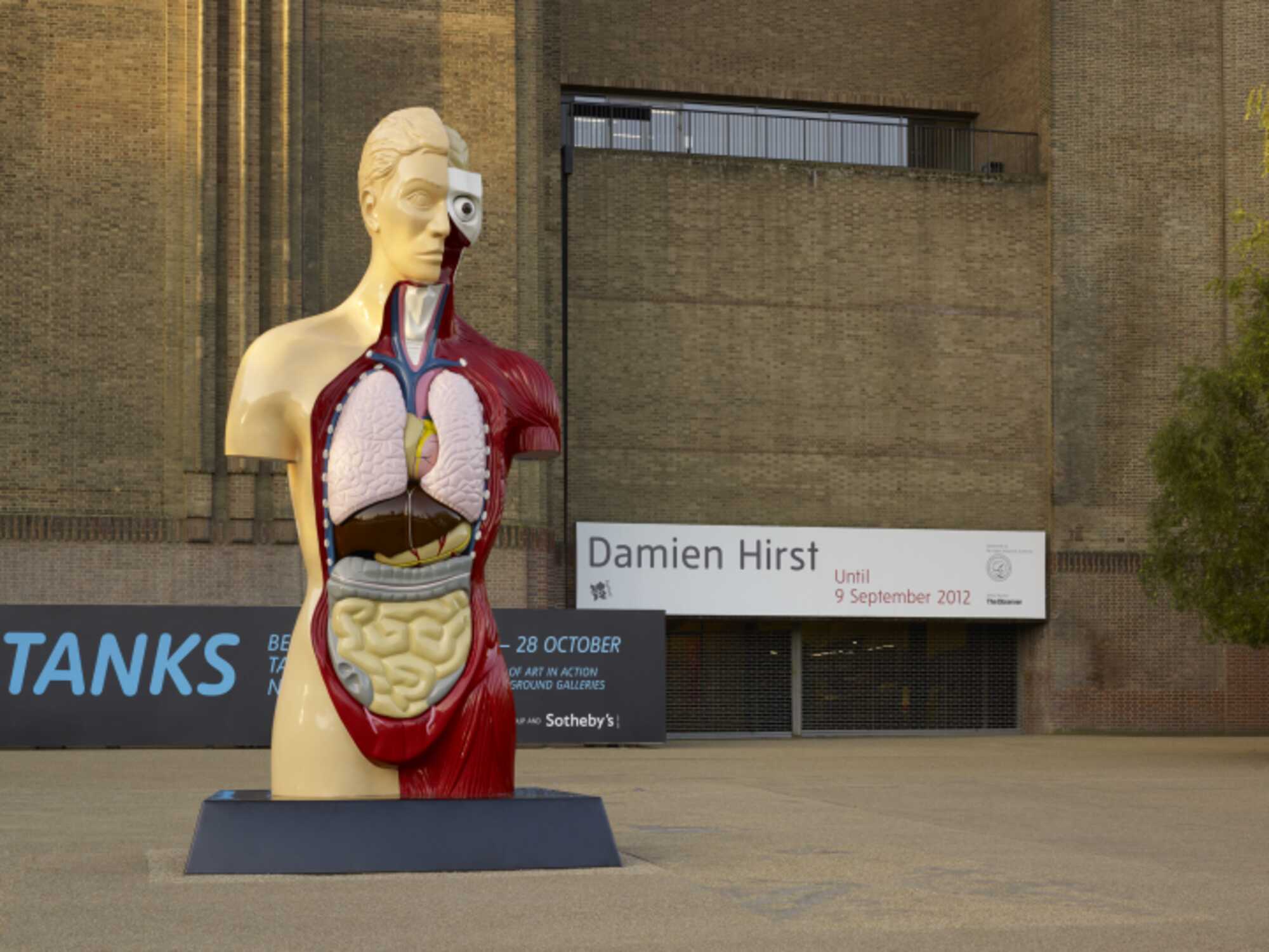 Standing at six metres high, the painted bronze sculpture Hymn (1999–2005), is a monumental reinterpretation of an educational anatomical model intended for use by children, in which a cross-section reveals the internal organs of the male torso.