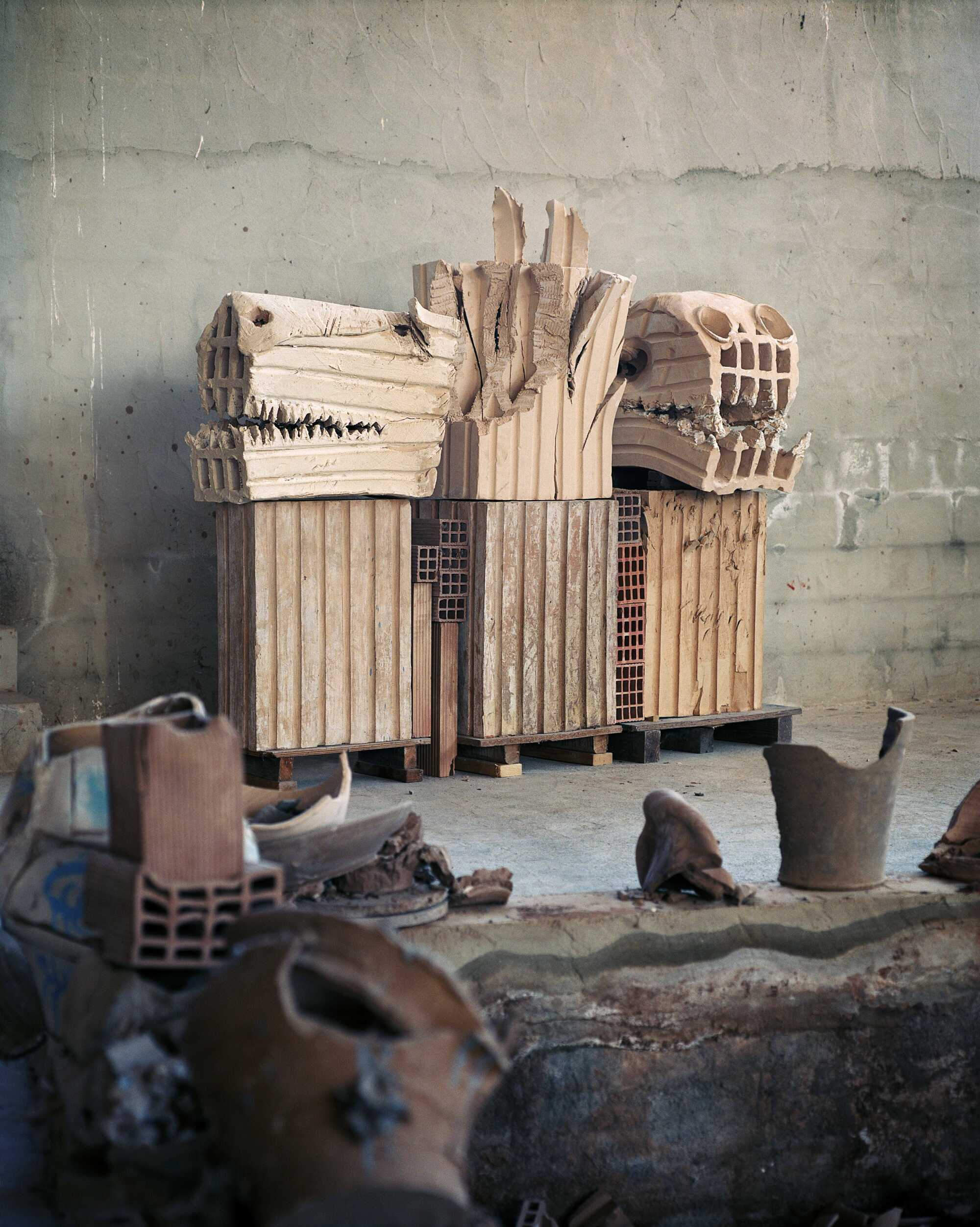 Den Mittelpunkt der Ausstellung bilden mehr als dreißig Keramikarbeiten. Diese zeichnen sich durch ihre Farbgebung aus und zeigen zerrissene, fragmentierte und perforierte Formen in ständiger Transformation, in denen figurative Elemente auszumachen sind, die an Pflanzen und Wasserlebewesen erinnern, Zungen, Blütenblätter, Flossen oder Blätter suggerieren und mitunter auch anthropomorphe Züge aufweisen. Unter diesen Werken ragen die Totems heraus, eine neue Serie großformatiger, aus aufeinander geschichteten Blöcken gebildeter Keramiken, die auf klassische Bauwerke und mythologische Charaktere verweisen.