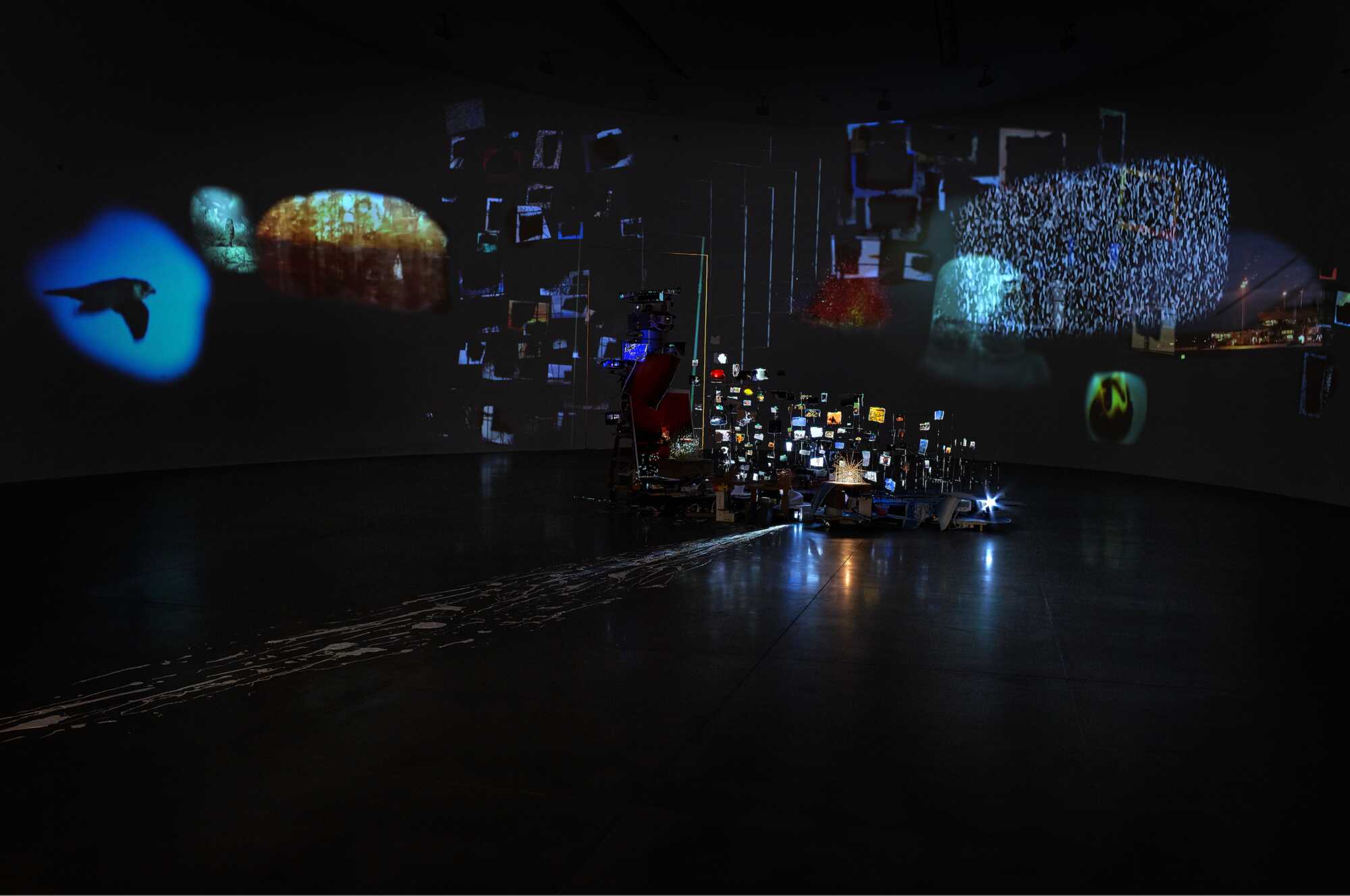 Bild: Sarah Sze, »Flash Point (Timekeeper)«, 2018, Mixed Media Installation, Holz, Edelstahl, Videoprojektoren, Acryl, Archiv-Pigmentdrucke, Keramik und Klebeband