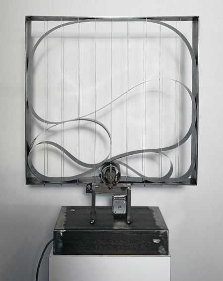 Programmierter Zufall auf Knopfdruck lässt harten Stahl fliessen und seine Verfassung und Form stetig ändern. Die kinetische Kunst von Bernhard Jordi hat sich im letzten Jahr stark verändert. Neu arbeitet er vermehrt mit Microcontrollern, welche seinen Objekten ganz besondere Bewegungen entlocken. Erinnerungen an die gute alte Lavalampe werden wach (und vom intellektuellen Kunstbetrachter gleich wieder unterdrückt).